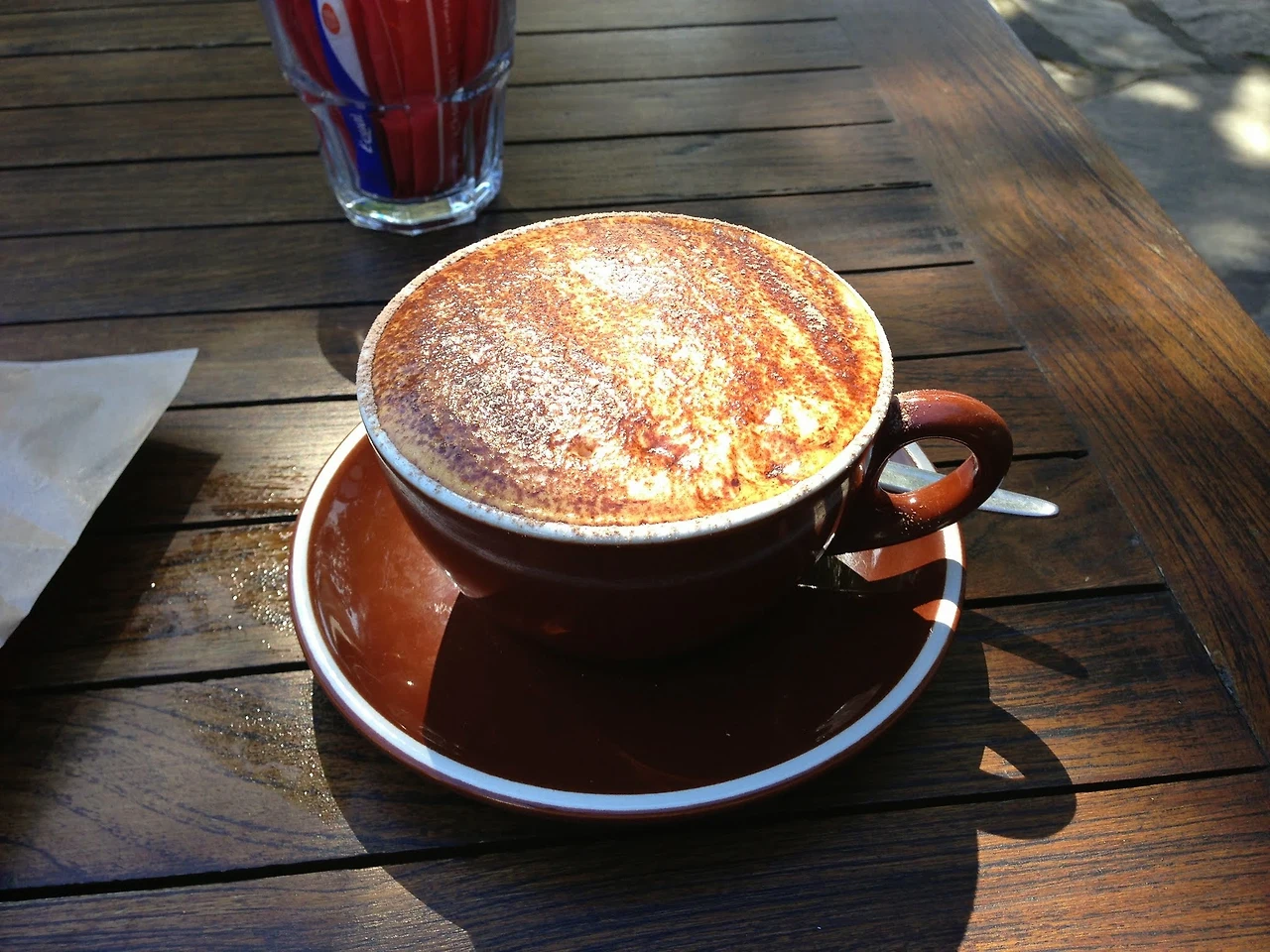 이 빵을 어디서 먹을까 고민 하다 빵만 먹으면 섭섭하니 커피와 같이 마시기로 했다. 근처에 괜찮은 곳이 있나 둘러보다가 넓은 공터 옆, 레스토랑에서 모카 카푸치노를 시켰다. 큰 컵에 모카 카푸치노 커피가 나왔다. 맛은 기대보다 그냥저냥.