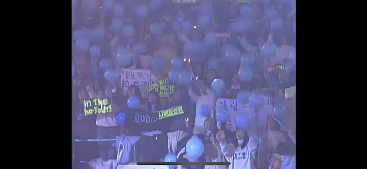 임원들이 급하게 달려와 우리 팬석을 향해 전달을 한 것인데 god가 나올 때 SM끼리 엎드려 있자는 것. 일종의 보이콧 같은 것이었다. 그리고 드디어 god가 나오는 순간! 그 넓은 장충체육관에서 중앙 쪽 두 칸을 차지하고 있던 <Fan god>만이 자리에서 일어나 응원하기 시작했다는 것이다. 지금 생각해보면 유치할 수도 있는데 하나 재밌었던 건 아무런 관련이 없던 <핑키>(핑클 팬클럽)와 유승준 팬클럽, 그리고 펄블루 풍선의 장나라 팬클럽도 마치 우리와 짠 듯이 god가 나올 때 그렇게 조용할 수가 없었다. 그리고 god의 무대가 시작되었고 수많은 <Club K.I.T.>와 <신화창조>, 우리 S.E.S. 팬클럽 <친구>는 전부 단체복을 머리까지 쓴 뒤에 그대로 엎드렸다. 핑클 팬클럽은 원래 마이웨이라서 가만히 있었고 유승준 팬클럽도 가만히 있었던 걸로 기억한다. 장나라 팬클럽도 풍선을 흔들어주지 않은 채 핑키처럼 가만히 있었다. 그 상황이 너무 궁금해서 그때 나는 고개를 살짝 들어 현장을 바라봤는데 와...하늘색 풍선만 흔들리고 있지, 강타 팬클럽과 신화창조, 우리는 엎드려 있지, 그와중에 핑클 팬클럽, 장나라 팬클럽, 유승준 팬클럽은 엎드려 있지는 않지만 한 명도 풍선을 흔들어주지 않고 있지...그와중에 내가 생각한 건 <Club K.I.T.>의 단합이었다. 정말 god 무대가 끝날 때까지 단 한 명도 고개를 들고 있지 않았던 것.