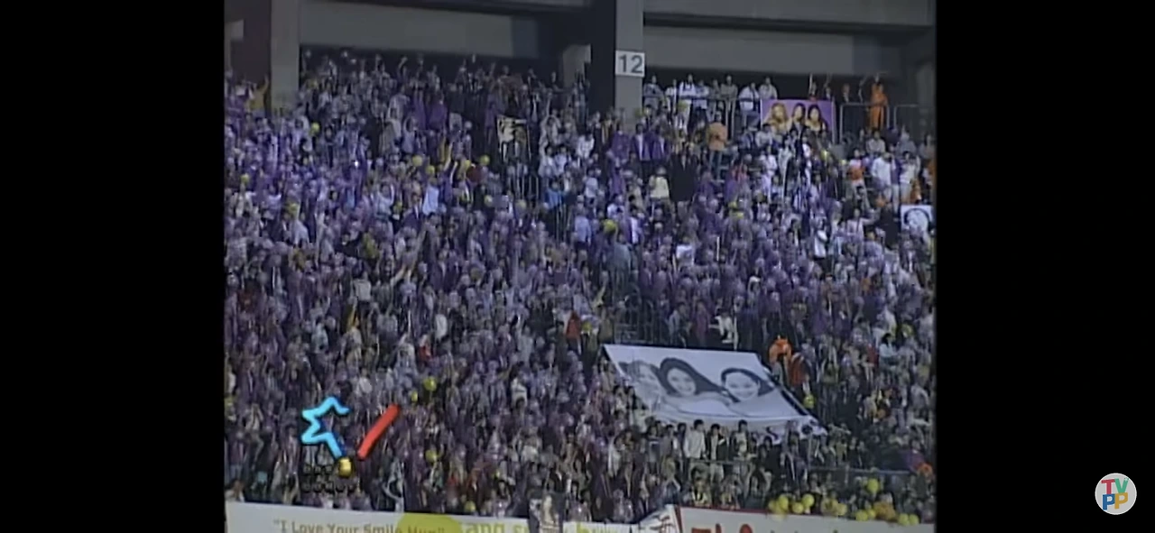 정확히 기억난다. 1,2층에 앉아 있던 핑클 팬클럽이나 클릭비 팬클럽, 강성훈 팬클럽, 블랙비트 팬클럽 등은 우리의 이런 모습을 보면서 과연 어떤 생각을 했을까? 갑자기 궁금해진다. 그러다가 언제였지? 3층 S.E.S. 팬클럽석 구석에 노란색 풍선을 든 사람들이 한 10명? 그 정도가 앉아 있는 걸 목격했는데 임원 누나, 형들, 다른 팬들에게 물어보니 <점핑보아>(보아 팬클럽)란다. 임원끼리 친해서 점핑보아가 우리 쪽에 앉았던 걸로 아는데 어쨌든 몇 몇 팬들은 펄보라 풍선 사이에 노란색 풍선 몇 개가 끼어 있는 걸 그렇게 좋아하지는 않았다. 거기에 보아가 나올 때 노란 풍선을 불어서 흔들어 달라고 하기도 했었는데 절반의 팬들은 그에 응하지 않았다. (그래서 보아가 나올 때 3층 우리 팬클럽석을 잠깐 비춰주는 장면을 보면 펄보라색 풍선 대신 노란색 풍선을 불어서 흔드는 S.E.S. 팬들이 보인다. 자세한 건 아래 사진 참조)