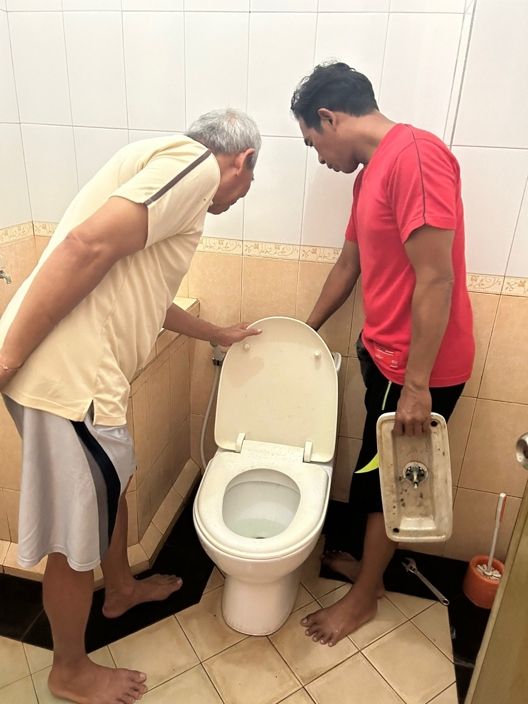 집주인과 테크니션이 와서 화장실을 봐주니 일견 든든한 마음도 들었다. 한국으로 치면 관리소장님과 관리소 기술직 직원이 온 거고, 한국 같았으면 바로 해결됐을 텐데... 그러나 우리의 인도네시아 테크니션은 아주 기다란 뚫어펑 기계를 가지고 와서 크게 힘을 발휘하며 쒜리 변기를 뚫기 시작했다! ㅋㅋㅋㅋㅋㅋ 이것은 기술인가? 힘인가?