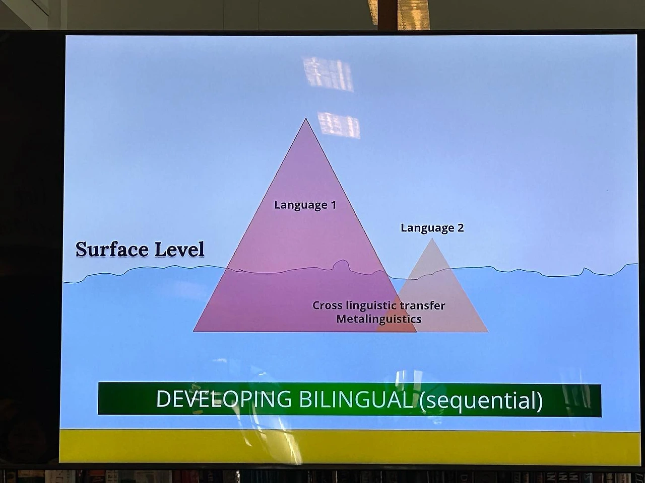 아래 그림들은 여러 개의 언어를 습득하는 데에 있어서 동시다발적으로 습득하는 것과 순차적으로 습득하는 것을 비교한 자료이다. 바닷물 아래로 잠겨 있는 부분이 잠재적인 언어 능력이다. 우리가 언어를 배우면 배울수록 물 위로 솟은 부분이 더 커지고 언어로 표현하고 활용하는 능력도 커진다. 또 두 삼각형이 겹친 부분이 메타언어 부분이 되는데 두 언어가 함께 성장하고 교접하게 될수록, 직간접적으로 두 언어가 주고받는 영향력이 커질수록 메타 부분이 커지면서 뿌리가 단단하게 자리잡혀 가게 된다. 이상적으로는 두 개의 우뚝 솟은 언어 빙산이 흔들리지 않으며 인식의 바다에 단단히 뿌리 내리게 되는 것이다. 여러 개의 언어가 단단히 얽혀 들어가며 빙산들의 덩치가 커지면 종국엔 빙산맥이 될 수도 있을 것이다.