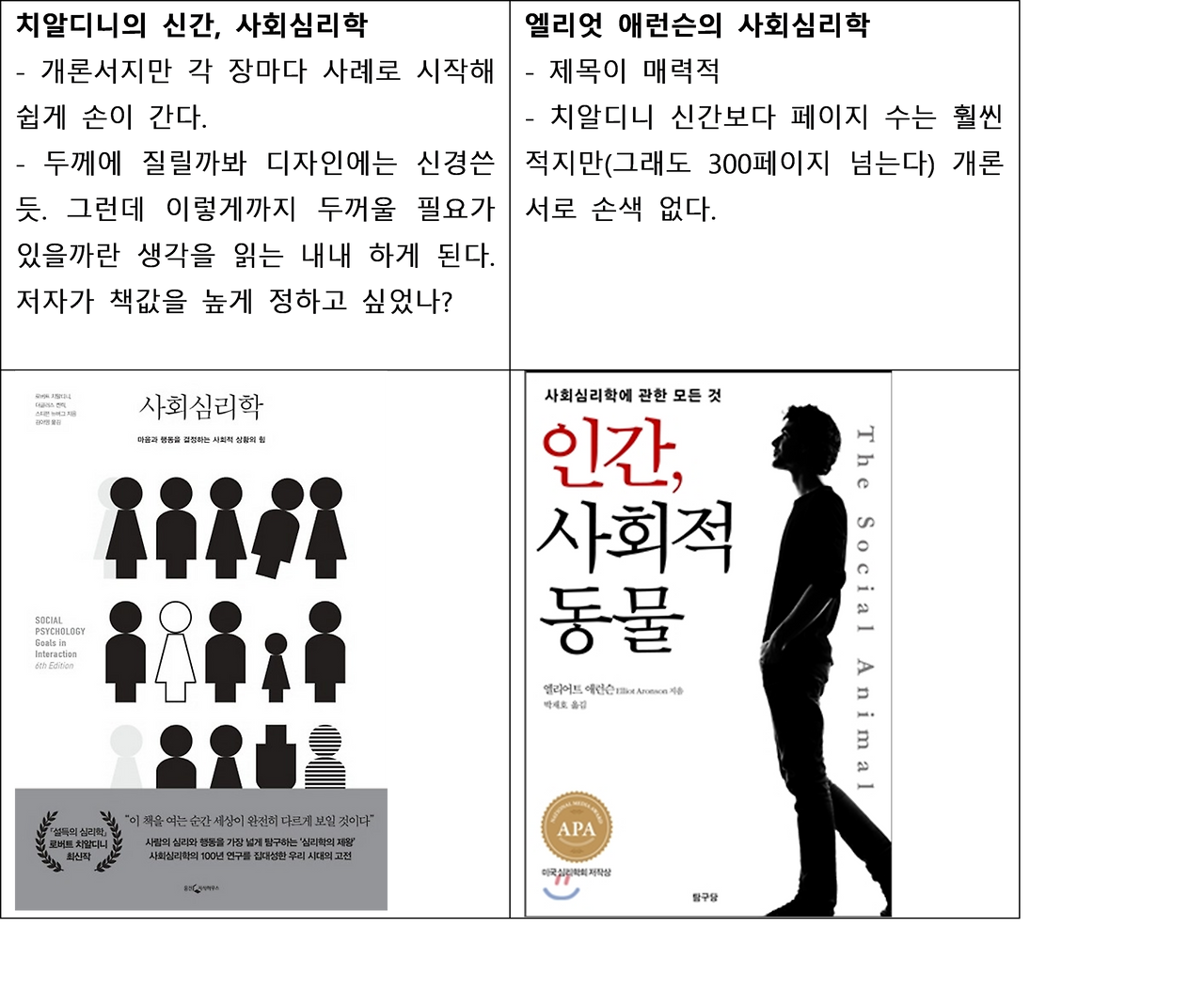사회심리학 개론서를 2권 읽었는데 짧게 비교해 봤다.