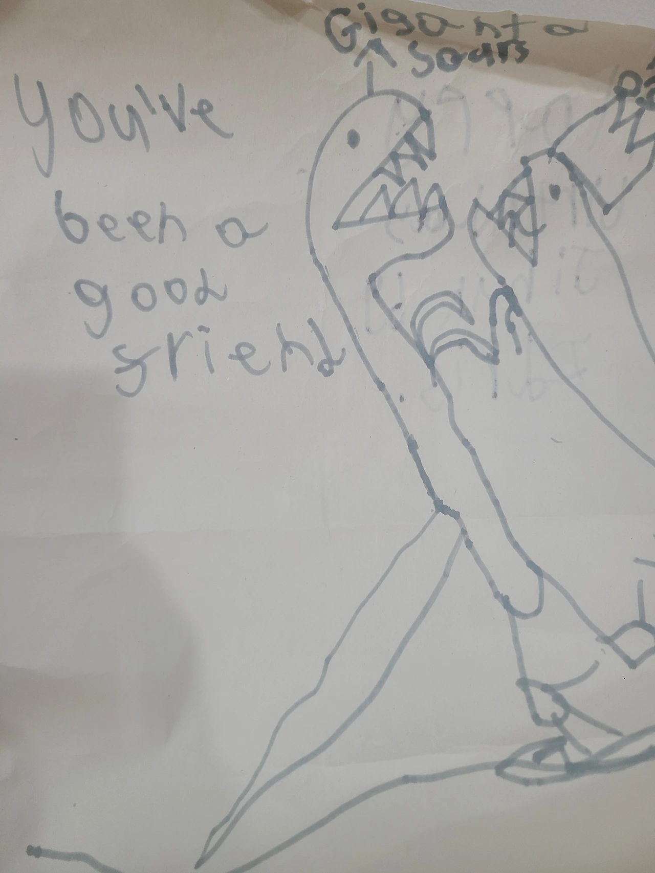 아들의 친구이자 그녀의 아들은 그들 둘의 모습을 공룡으로 그려 '너는 나의 좋은 친구'라며 글을 썼다. 그림 속에서 이빨을 드러내며 웃는 둘은 분명 누가 봐도 공룡이지만, 그림 속의 그들은 내게 도무지 무섭지 않다. 오히려 당장이라도 끌어안을 듯, 서로를 반가워한다