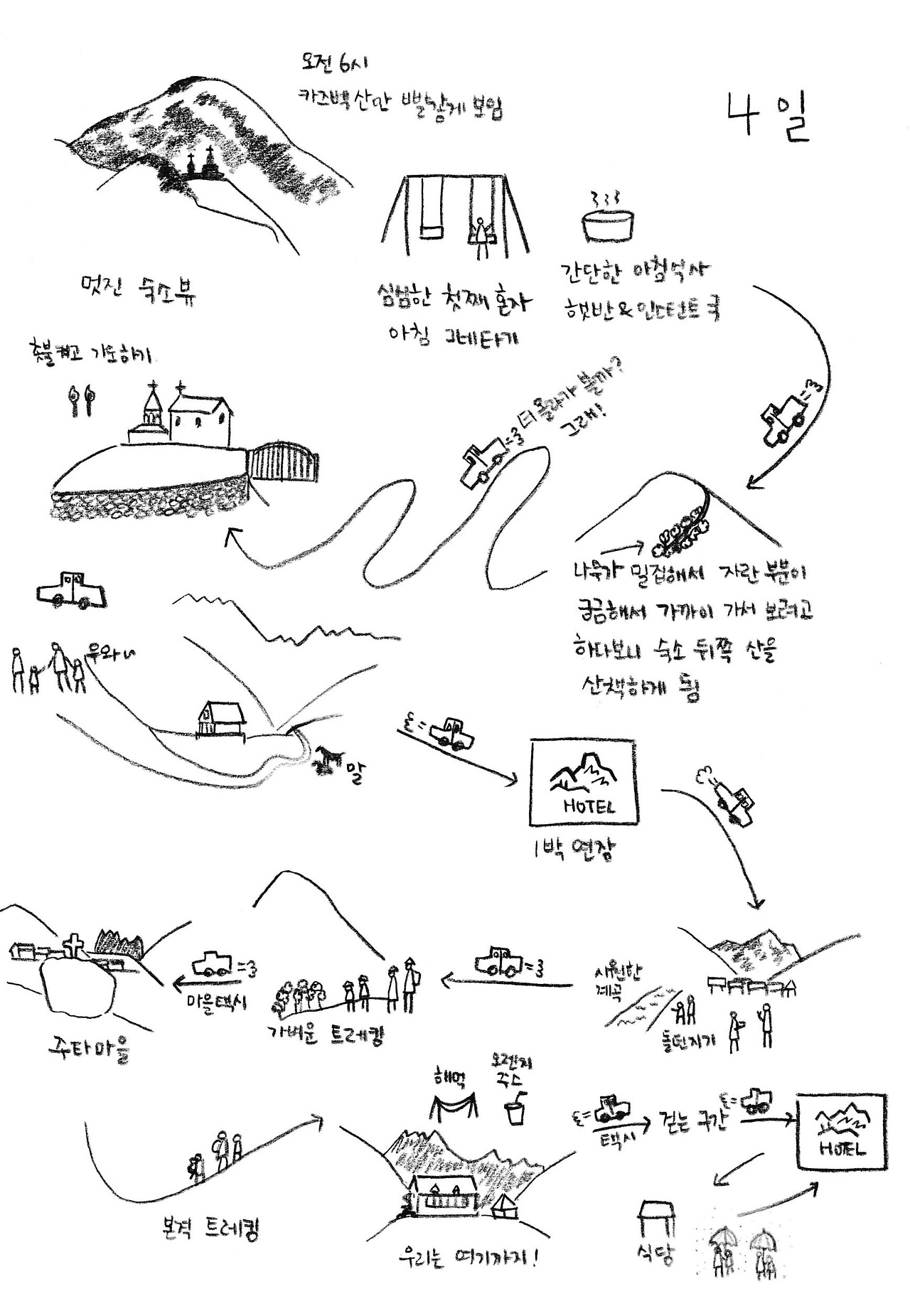 새벽부터 깨는 첫째 아이 덕분에 하루의 시작이 빨라진다. 둘째 아이는 피곤했는지 부산스러운 소리에도 일어나지 않는다. 동생이 없어 심심한지 혼자 밖으로 나가 그네를 탄다. 아직 새벽 시간이라 산 위로 해는 떠오르지 않았고 카즈벡산만 햇빛을 받아 빨갛게 달아올랐다. 붉게 물든 카즈벡산을 보고 있자니 오늘도 더울 것 같은 예감.
