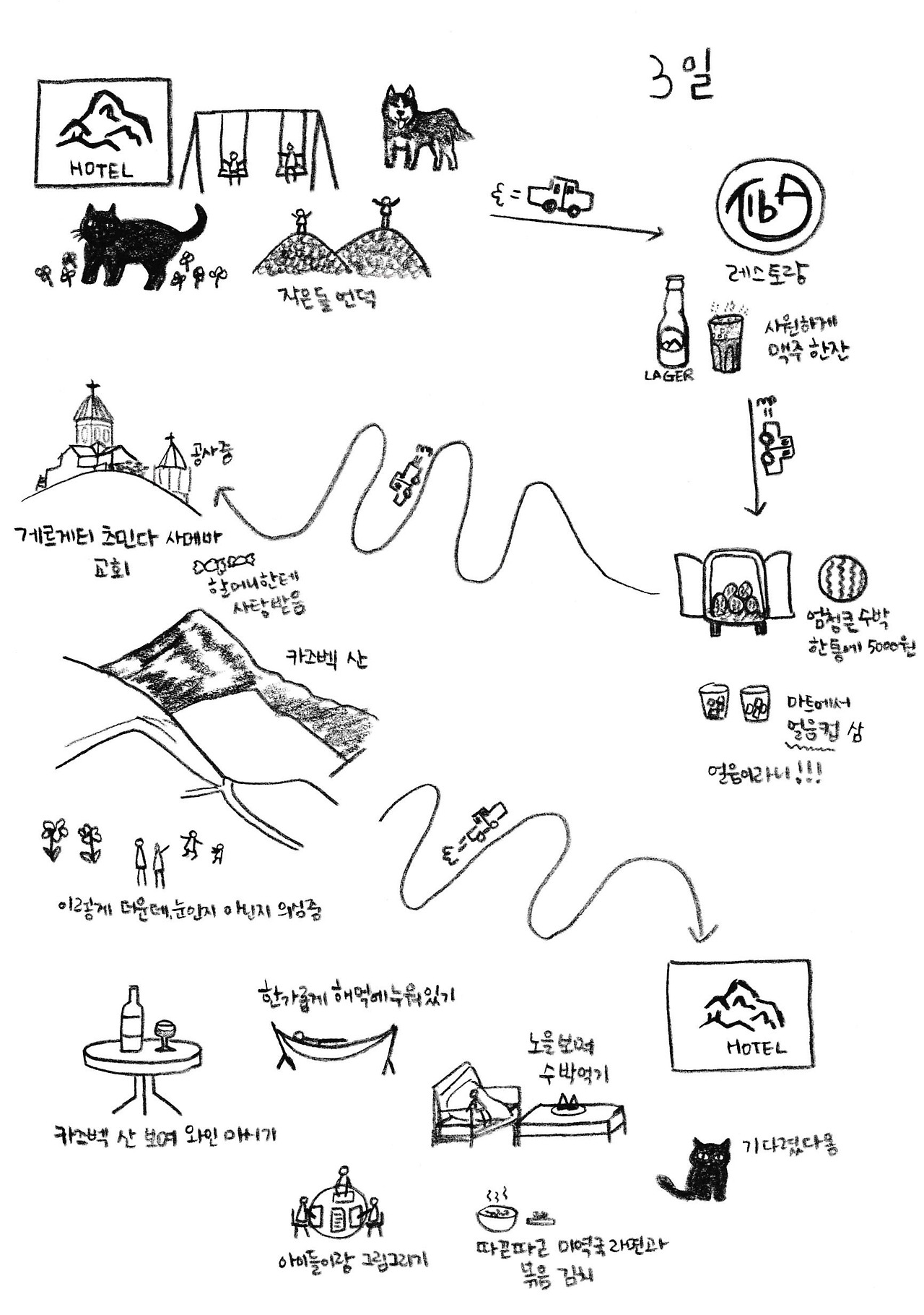 그의 말에 의하면 예약할 때 아이 2명을 추가하는 옵션이 없어 일단 성인 2명으로 예약을 했었다고. '어떻게든 되겠지.' 주의자인 그의 기질이 어김없이 발휘됐다. 아이 2명에 대한 추가금 지불을 위해 주인아주머니와 협상을 해야 했는데, 주인아주머니께서 조지아어만 할 줄 아셔서 다른 방에 묵고 있는 투숙객에게 통역을 부탁하게 되었다. 손짓발짓으로 한 협상은 결과적으로 나쁘지 않게 마무리됐다.