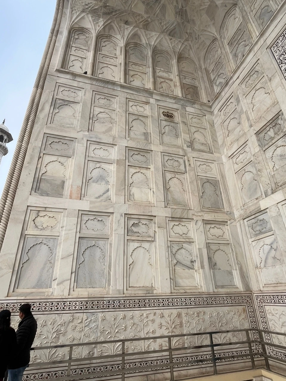 타지마할 안에는 건물 보호를 위해 신발 커버를 신어야 입장할 수 있는데 건물 안에 들어선 순간 왜 이 건물이 불가사의라고 하는지 알 수 있었다. 한 나라에서 단시간에 조달할 수 없는 어마어마한 양의 대리석과 보석들, 이보다 더 정교할 수 있을까 싶은 벽과 천장, 바닥들을 보며 연신 감탄사가 나왔다. 더욱이 나를 놀라게 한 것은 타지마할의 벽의 보석들이 모두 꽃잎 모양으로 세공해서 끼워 넣었다는 사실이었다. 정교한 이 작업들을 위해 얼마나 많은 사람들의 피와 땀이 들어갔을지 상상조차 가늠이 안되었다.