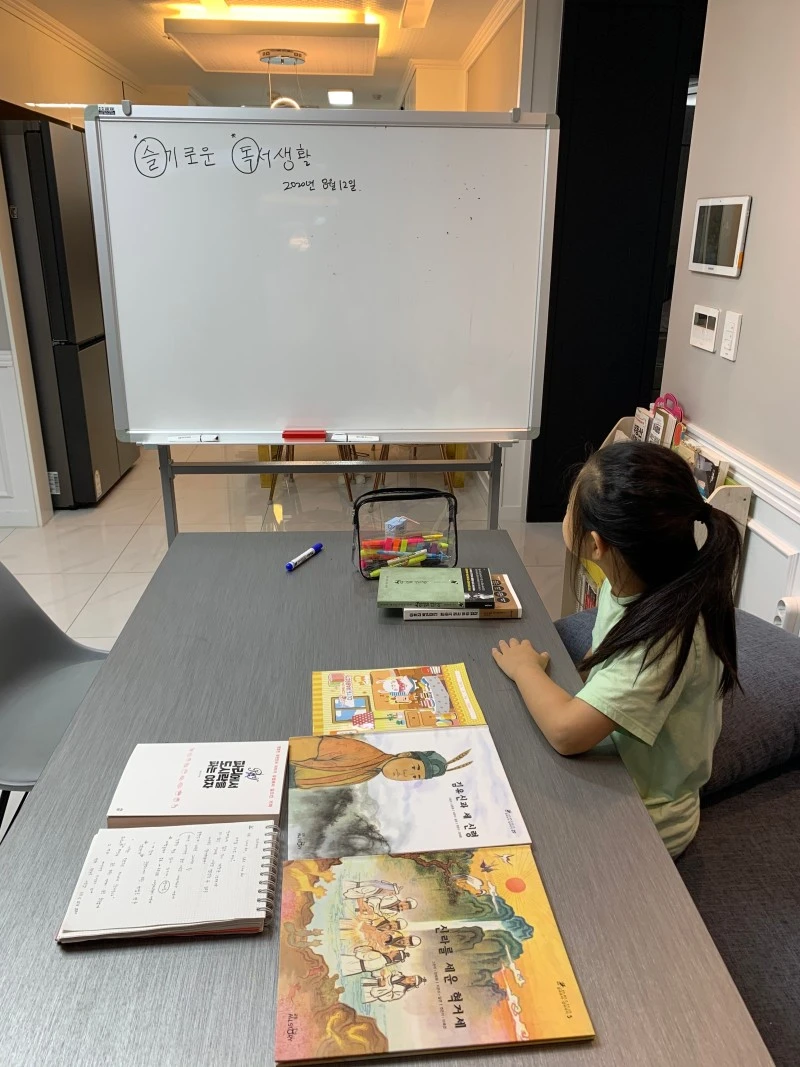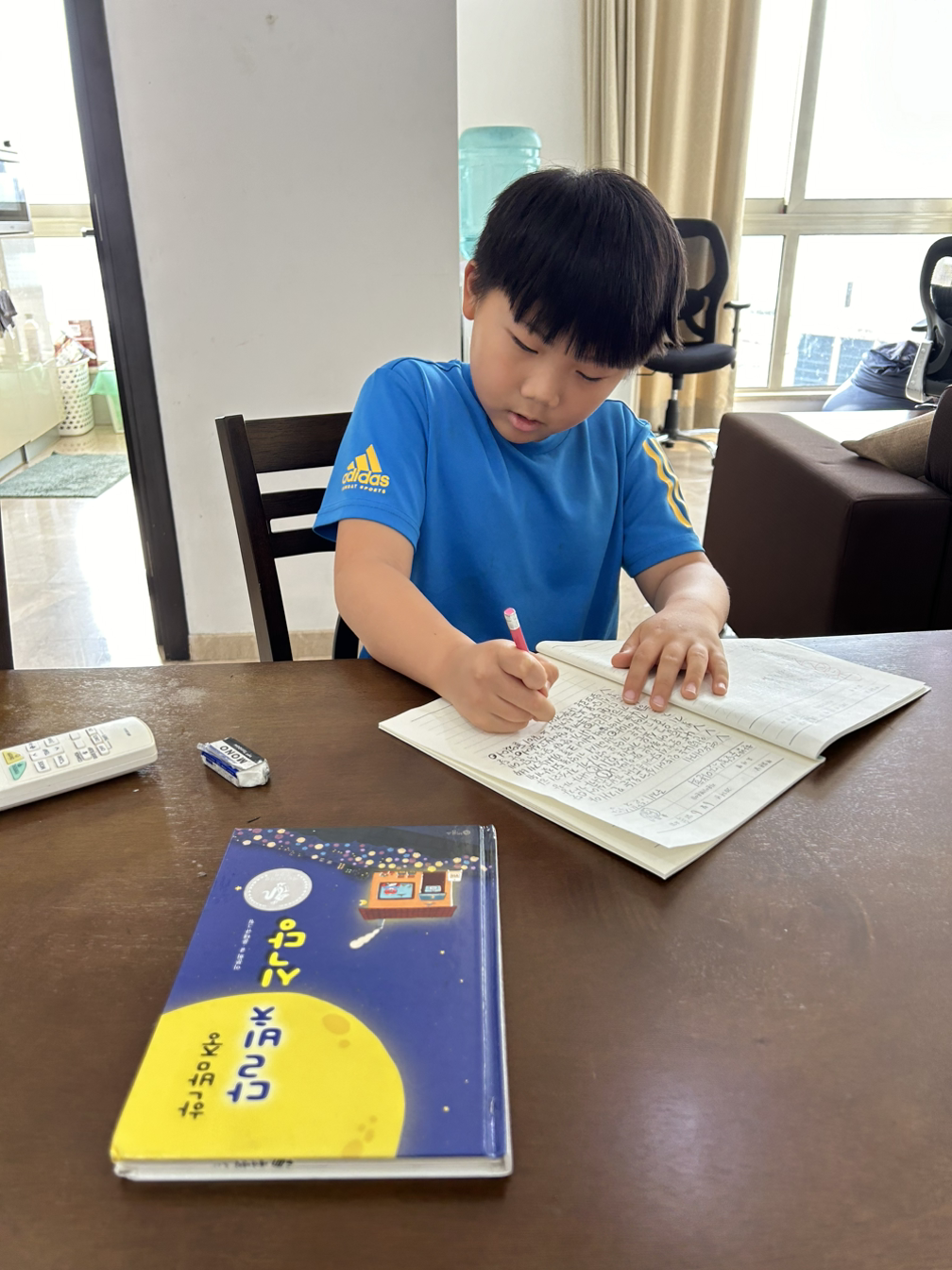 아이들이 해외에 살면서 가장 힘든 점은 국제학교를 다니면서 아마 한국책을 읽는다거나 한국어로 글을 쓰는 기회가 없기 때문에 문해력, 독해력이 그만큼 낮아질 수밖에 없다는 점일 것이다. 물론 처음에는 받아쓰기를 무척 어려워했지만 아이들은 조금씩 수업을 하며 맞춤법을 배우고 한국말로 나의 생각을 정리해 보며 글을 쓰고 있다. 연필의 사각거리는 소리는 그 어떤 소리보다 아름답다. 눈을 반짝이며 골똘히 생각하고 자신의 생각들을 글로 써 내려가는 아이들을 보면 꼭 안아주고 싶을 만큼 너무 이쁘다. 나에게 일주일에 한 번씩 아이들과 하는 책 수업은 아이와 함께 동화책을 통해 생각들을 서로 주고받을 수 있는 가장 행복한 시간이 되었다. 또한 동화책을 통해 아이들의 마음을 직접 물어서 듣지 않아도 슬쩍 훔쳐볼 수 있다는 점도 장점이다.