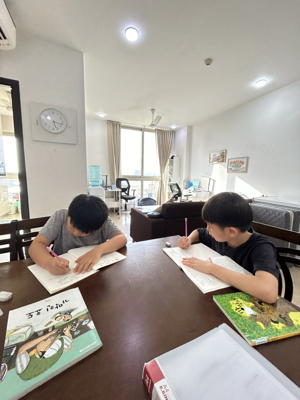 일본은 한국과 시차가 없어서 어렵지 않게 줌으로 수업을 대체할 수 있었기에 거의 10개월 이상 수업을 했다. 하지만 인도에 와서는 시차 때문에 큰아이와 친했던 친구와의 수업을 줌으로 더 이상 이어갈 수 없게 되어 아쉬웠다. 그나마 중학생이 된 큰딸은 2년 동안 논술수업을 진행했었지만 논술수업을 해 보지 않았던 이제 초3학년이 된 아들에겐 지금이 수업을 하기 더없이 좋은 기회란 생각이 들었고 마침 위층에 살고 있는 한국인 4학년 형이 있어서 함께 수업을 시작하게 되었다 역시 혼자 하는 것보다 함께 하니 시너지도 생기며 작은 아이는 일주일에 한 번씩 하게 된 엄마가 해주는 논술수업을 기다리고 좋아한다.
