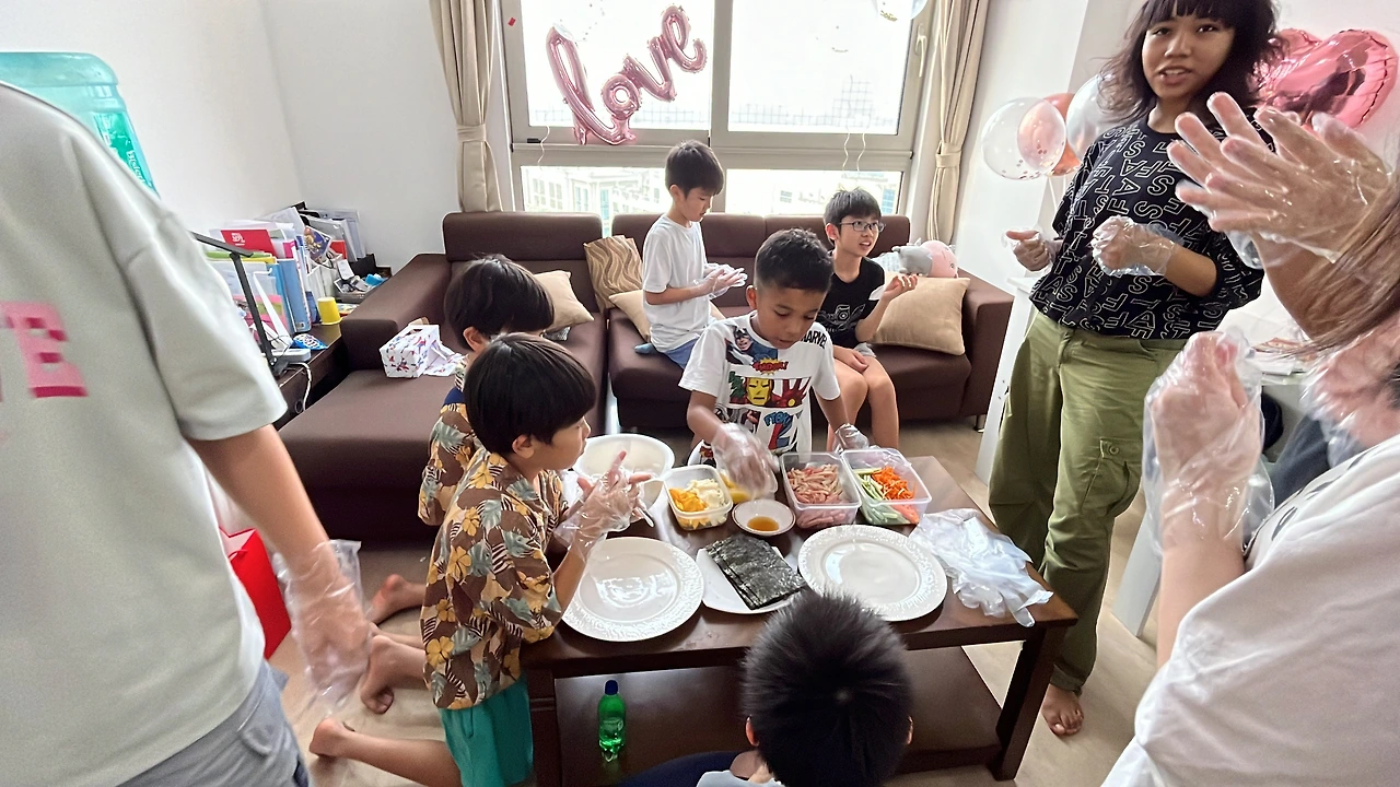 이어서 한국의 대표 음식인 김밥 싸기 체험이 이어졌다. 먼저 나의 딸이 시범을 보여주었는데 일본 친구들에게는 익숙하지 않을 김밥이었지만, 준비된 재료를 하나하나 정성스럽게 말아보는 과정은 뜻깊었고 또 생각보다 김밥을 잘 만들어서 놀랐다. 아이들은 자신이 만든 김밥을 자랑하며 맛있게 먹었고, 한국의 전통 음식을 함께 나누는 순간은 서로의 문화를 이해하는 소중한 시간이 되었다.