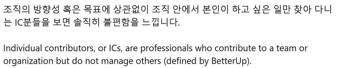 잠깐 옆길로 샜네요. 제가 이직을 결정한 이유 중 하나는 조직을 리딩 해서 조직으로 함께 일을 하고 싶은 마음이 컸습니다. 명확한 목표를 가지고 각자가 해야 할 일을 정의하고 그 과정에서 적극적인 협업을 통해서 그 목표를 달성하는 것이죠. 여기에 연차가 생기는 작더라도 제 조직을 가지고 제가 가지고 있는 목표와 방향성을 조직원들과 공유하고 뭔가를 달성하고자 하는 마음이 컸습니다. 그리고 이 부분을 채워줄 수 있는 회사라면 이직을 하겠다고 생각을 했습니다. 당연히 이게 절대적인 이유는 아니죠.