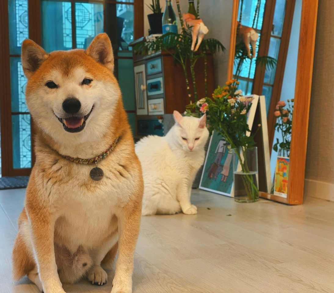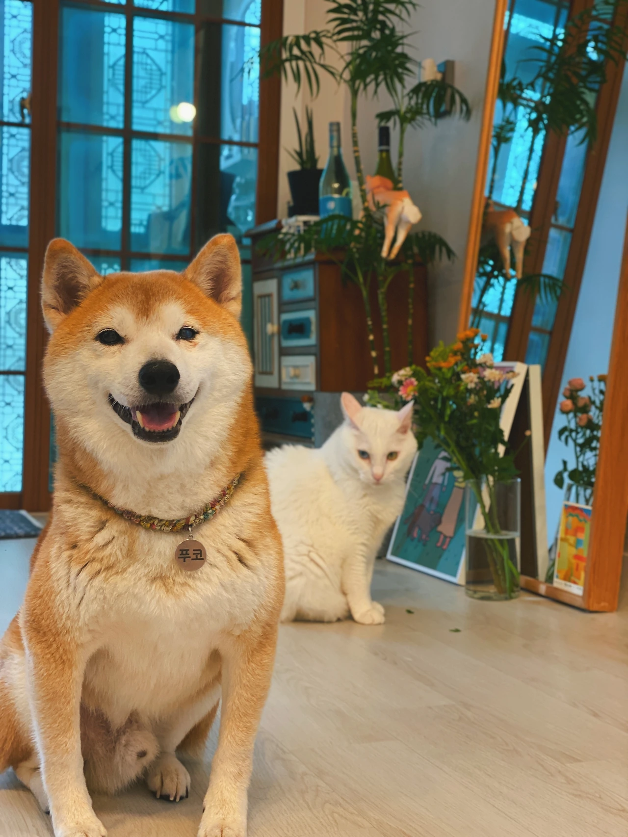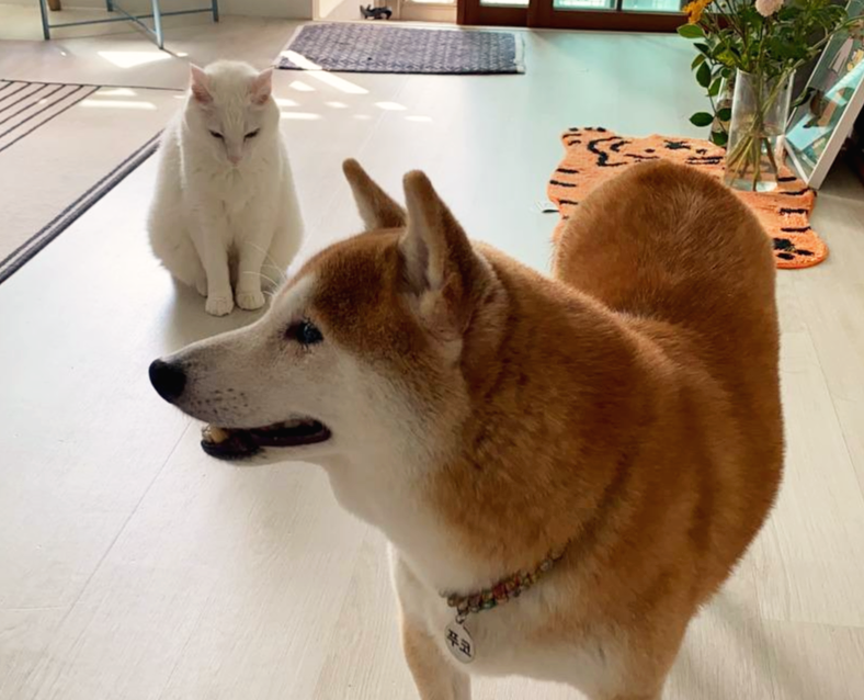 A. 인간은 좀 조용한 편이에요. 말이 별로 없고 저처럼 누워있는 거 좋아하고 집 밖에 잘 안 나가더라고요. 화장실 잘 치워주고 밥 챙겨주고, 잘 쓰다듬어 주니까 크게 불만은 없어요. 그런데 저희 집에 푸코 님이 있어요. 개죠. 개랑 살아보는 건 처음이에요.