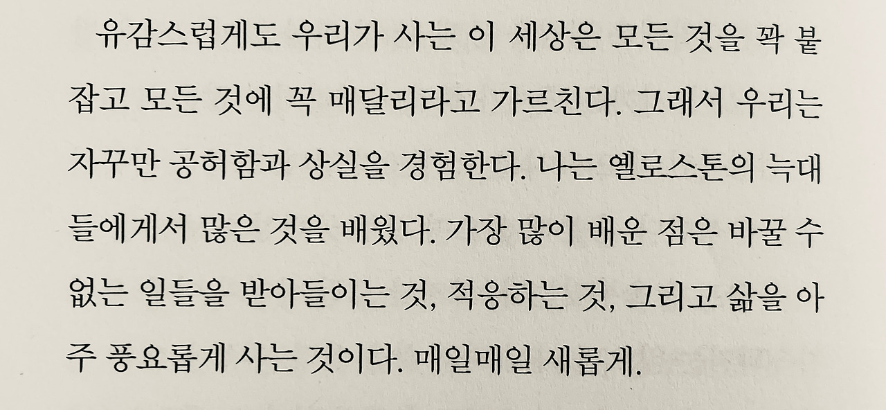 무튼 매 순간이 전부라는 말이지. 생각해 봐. 뉴스를 검색해보면 알지. 갑자기 생을 마감하는 무수한 사건들. 소나기처럼 날아든 소식들. 슬퍼할 틈도 없이 떠난 많은 것들. 그리고 또 새로이 나타나는 것들 모두. 그냥 그게 전부야.