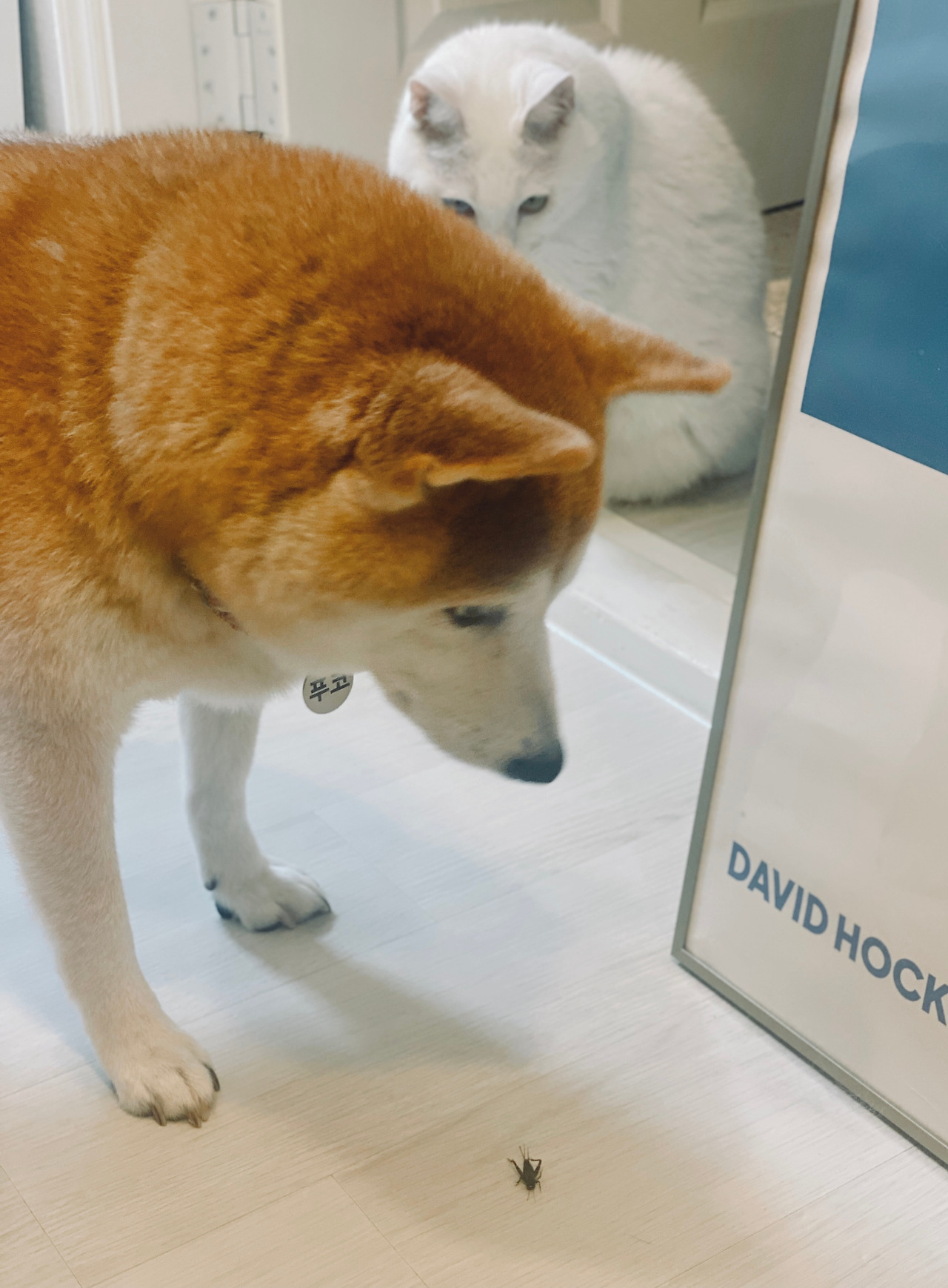 한 번은 진한 분홍색의 예쁜 똥이 나왔길래 이게 도대체 뭘지 산책 내내 고민을 했다. 그리고 어느날 청소를 하다 분홍 똥의 원산지를 알아냈다. 바로 두부의 화장실 모래.. 향긋한 냄새가 나서 그런지, 두부가 화장실 밖으로 떨어뜨린 모래를 푸코가 꽤 많이 주워 먹었고, 이를 알턱없는 반려인은 두부가 참 화장실을 깨끗하게 쓴다고만 여겼다. 다행히 화장실모래는 압축 두부(진짜 그 네모난 두부)로 만든 것이라 건강에 유해하진 않지만, 덕분에 원치 않게 예쁜 똥을 보았다. 또 어느 날은 샛노란 변이 나왔다. 너무 밝고 부드러웠기에 혹시 탈이 난 건가 걱정했으나 문득 두부 사료가 머리에 스쳐 지나갔다. 두부가 훔쳐먹다 떨어뜨린 고양이용 사료들을 푸코가 실컷 주워 먹었던 것이다. 고양이 사료는 개 사료보다 많이 기름져서인지 유독 녀석의 똥은 물컹물컹했다. 두부가 왜 푸코를 그렇게 때리고 싶어 하는지 조금은 알 것 같다. 사료도 훔쳐먹고, 화장실도 훔쳐먹으니 두부가 보기엔 곳간털이범.