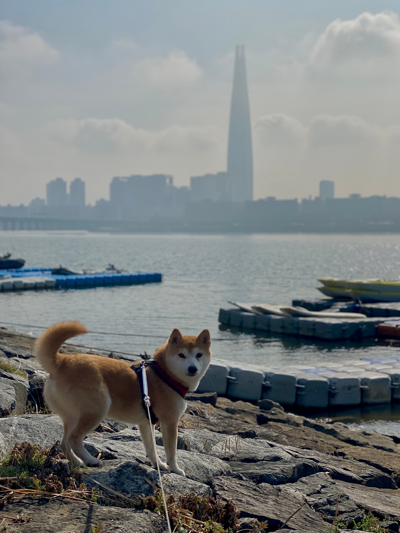 강바람에 실려오는 낯선 냄새 때문인지 푸코는 걷다가 가끔 멈춰 강바람을 만끽한다. 슬쩍 눈을 감고 바람결에 털이 빗겨나는 걸 보면 녀석이 행복하다는 걸 넌지시 느낀다. 가끔 강가를 따라 러닝을 하곤 하는데 비릿한 강바람은 늘 새롭다. 새삼 '나의 도시는 이런 모양새구나.' 하며 눈에 익숙한 도시의 풍경을 낯설게 담아본다.