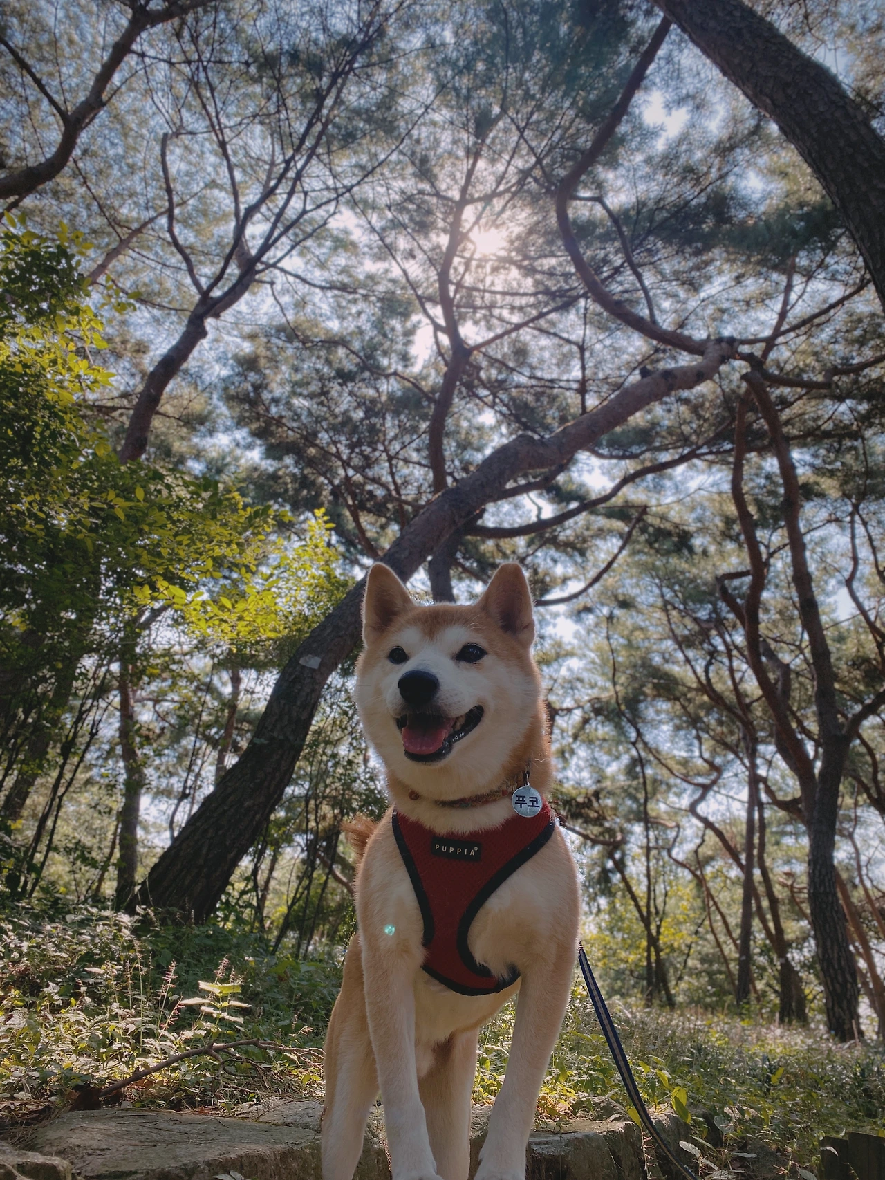 3. 그다음으로 우리가 자리 잡은 곳은 산 바로 초입이였다. 정말 초입이였다. 산이라기보다 둘레길에 가까웠음에도 열린 창문 틈새로 넘어오는 공기는 달랐다. 멍멍이 개체수가 많은 동네는 아니였다. 다른 강아지를 만날 일이 그리 많지 않은 산책길이였다. 덕분에 조금 편하기도 했다. 푸코가 사회성이 그리 좋은 편은 아니라서, 산책하는 입장에서는 고요한 산책을 즐기기에 좋았다. 다만 도심에서 맡을 수 없었던, 청솔모나 고라니, 멧돼지 같은 야생동물의 등장과 체취는 푸코를 역대급으로 흥분시키곤 했다. 푸코는 처음 듣는 소리를 냈다. 흥분되고 신나는데 무서운 듯한 온갖 스탠스를 취한다.