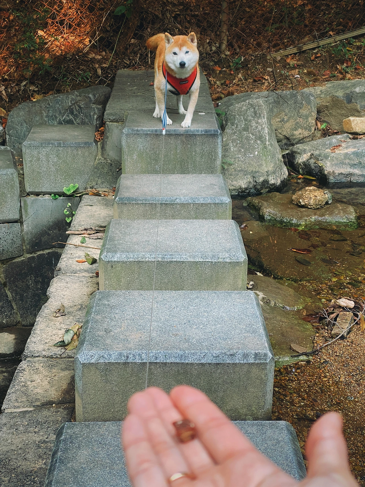 주인이 먼저 안전하다는 것을 증명하면 그제서야 따라오고 살짝 용기를 내본다. 거기다 발이 물에 젖는 것을 싫어해서 비가 오는 날이면 조심스레 걷고는 집에 들어와서 한창을 그루밍 한다. (가끔 고양이 같다.)
