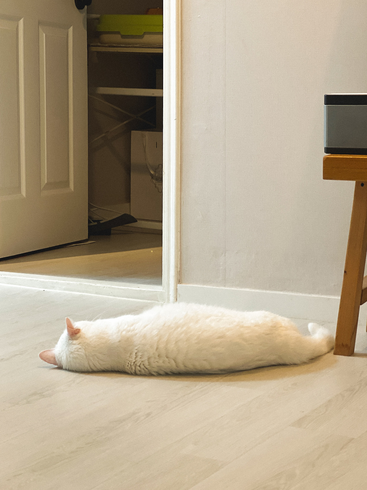 우선 두부는 여기 저기 바닥을 굴러다닌다. 에어컨으로 시원해진 거실바닥을 온 몸으로 닦으며 먼지와 함께 굴러다니고 있다. 에어컨이 켜지지 않은 날이면 지면에서 한참 떨어진 캣타워 맨 윗칸을 차지하고 누워있다.