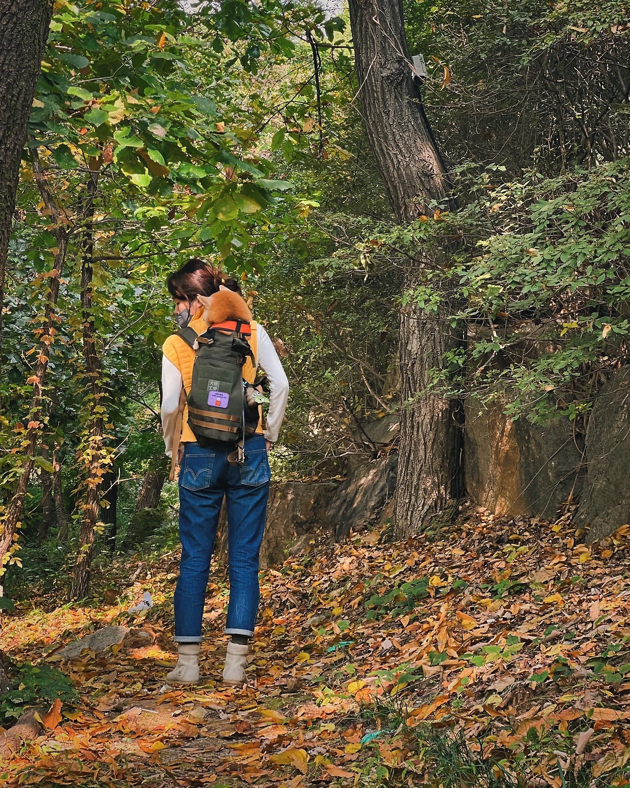 변수들을 최대한 제거하고자 복잡한 길들은 녀석을 들쳐 메고, 너른 공원이나 한적한 들, 평원을 찾아간다. 촌스런 강아지는 처음엔 업히는 가방을 어색해하더니, 이제 녀석은 등에 업히면 어딘가 뛰다니기 편한 곳으로 간다는 걸 아는 건지 순순히 반려인의 등에 몸을 맡기곤 한다.