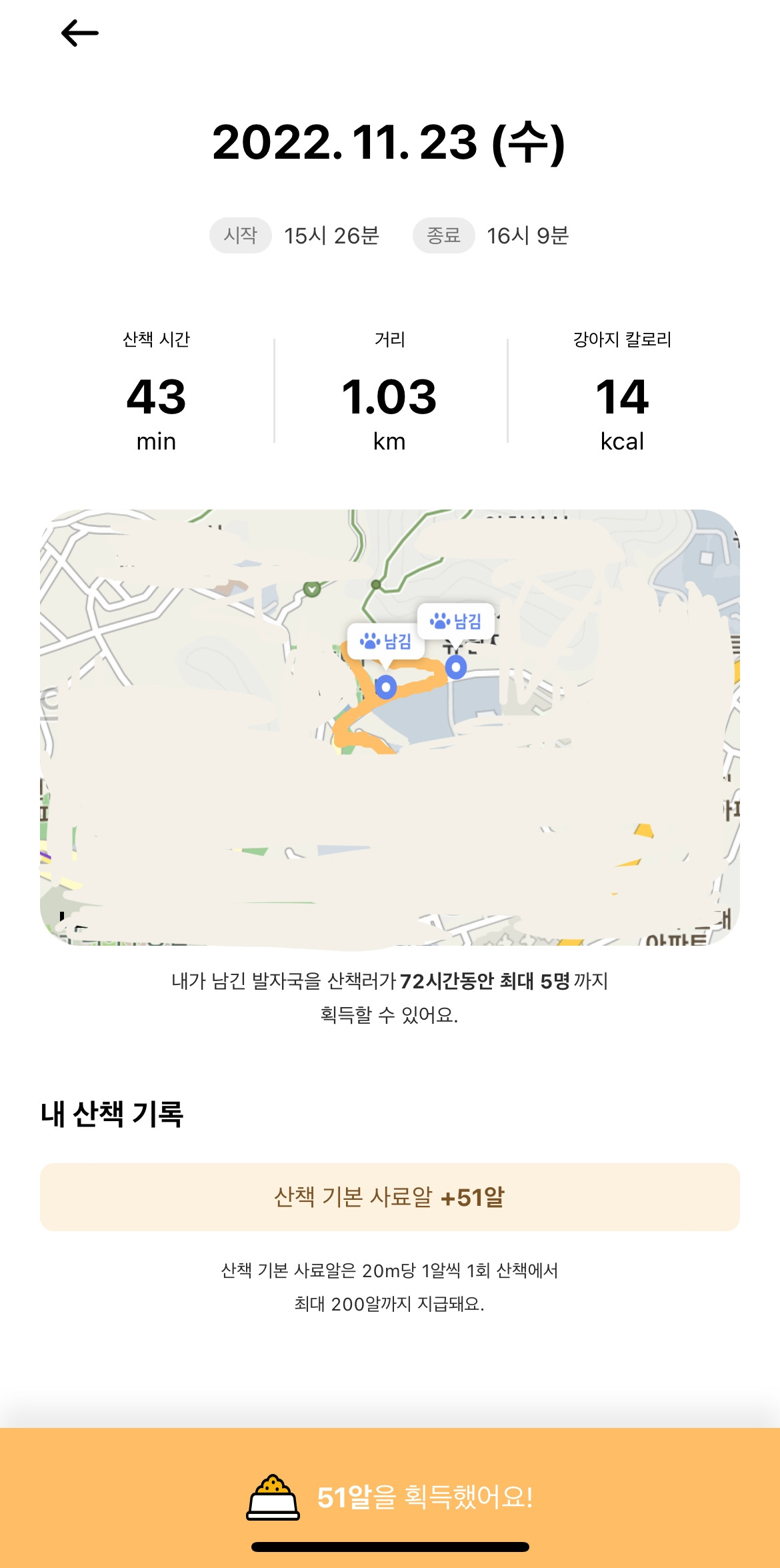 다른 강아지들과 네트워킹 하고 싶은 마음에 설치한 어플인데, 왠지 우리의 처지만 복기시켜주는 기분이 들어 다음날 산책 때는 어플을 켜지 않았다. 하지만 이내 어플의 목적을 '푸코의 질환으로 인한 산책 행동 패턴의 변화 기록'이라는 개인적인 목적으로 설정하였다. 질환이 악화될수록 녀석이 어떤 산책 루트를 갈 때 가장 불편하지 않게 속도를 내며 갈 수 있을지, 또 평균 산책시간이 어느 정도 되어야 녀석에게 부담이 되지 않을지 당분간 체크해보기로 했다.