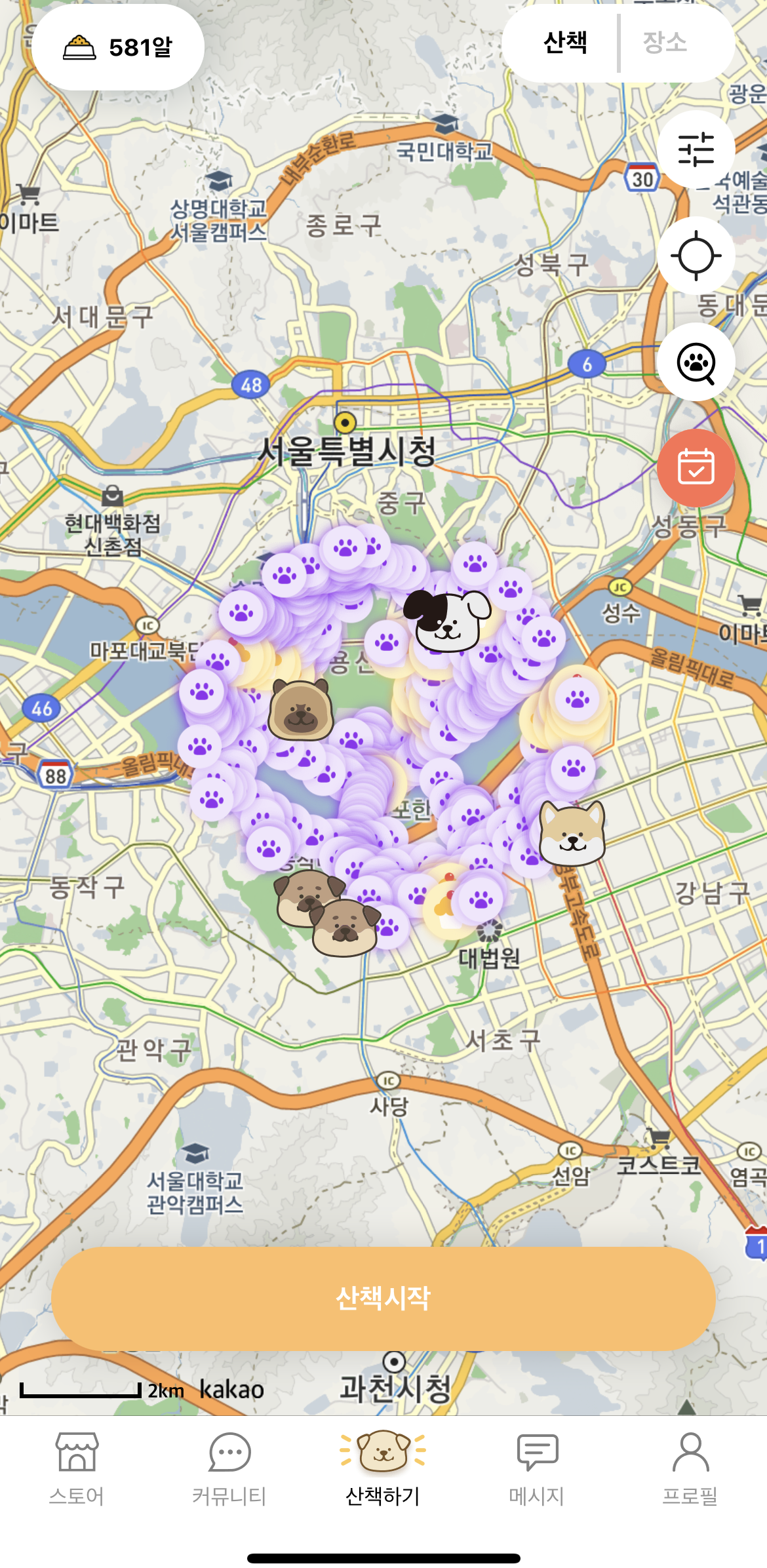 우리 집 주변의 지형이 지도에 표시되고 근처를 돌아다닌 강아지들의 마크가 표시됐다. 우리 동네는 아파트 밀집 지역은 아닌지라 비교적 그 빈도가 적었다. 푸코와 나의 발자국으로 동네 지도를 가득 채우고 싶은 욕망이 생겼다. 350m마다 어플은 지도에 발자국을 자동으로 남겨주었다. 보통 산책을 한 번 나가면 짧게는 30분, 길게는 2시간 정도 하기에 텅 빈 거리를 우리의 발자국으로 남기리라는 거대한 포부를 안고 어플을 켜고 첫 산책을 나섰다.