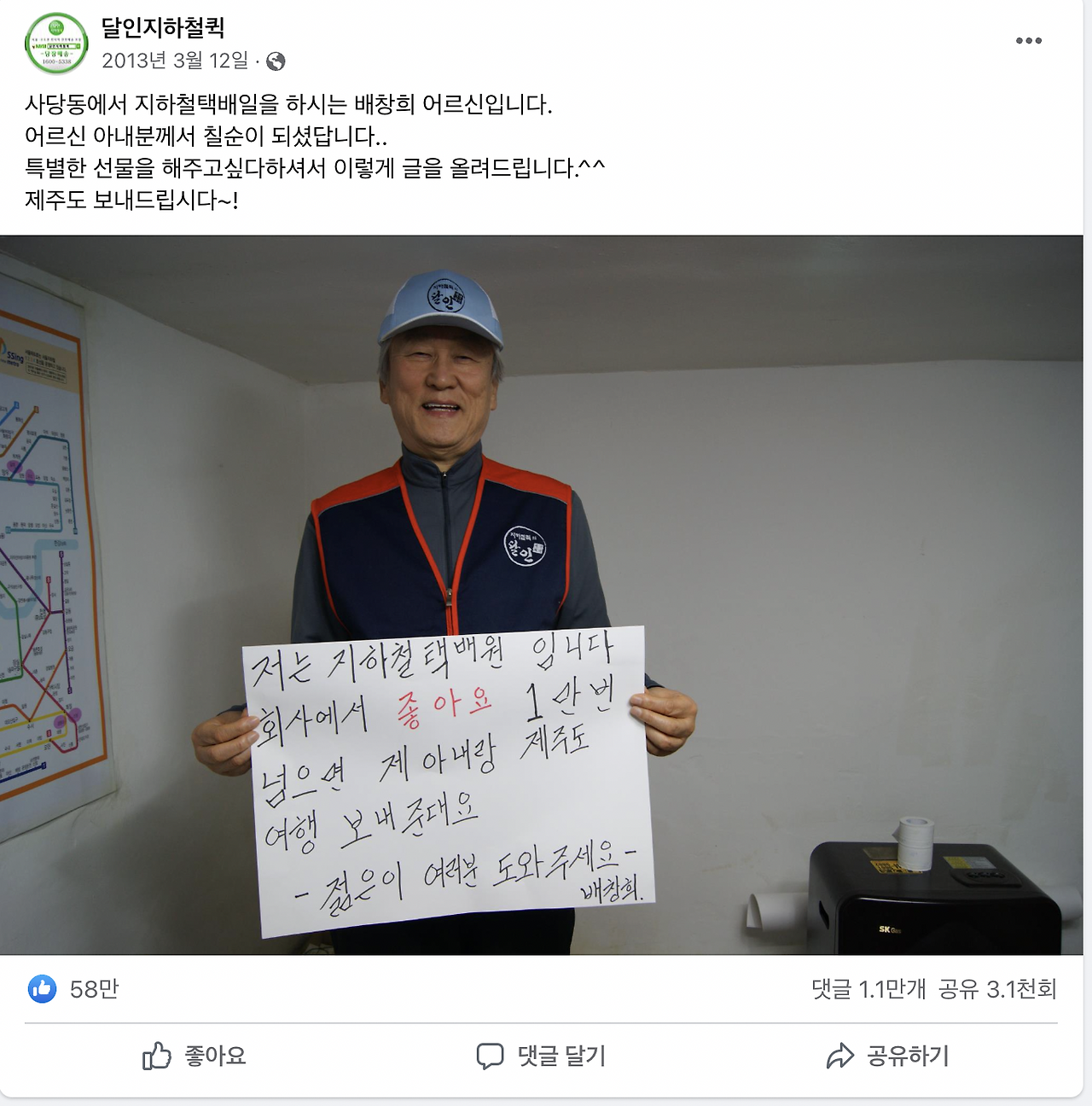 그래서 나도 달인지하철퀵 페이스북 페이지를 만들고 어르신 한명의 사진과 함께 페이스북에 글을 올렸다.
