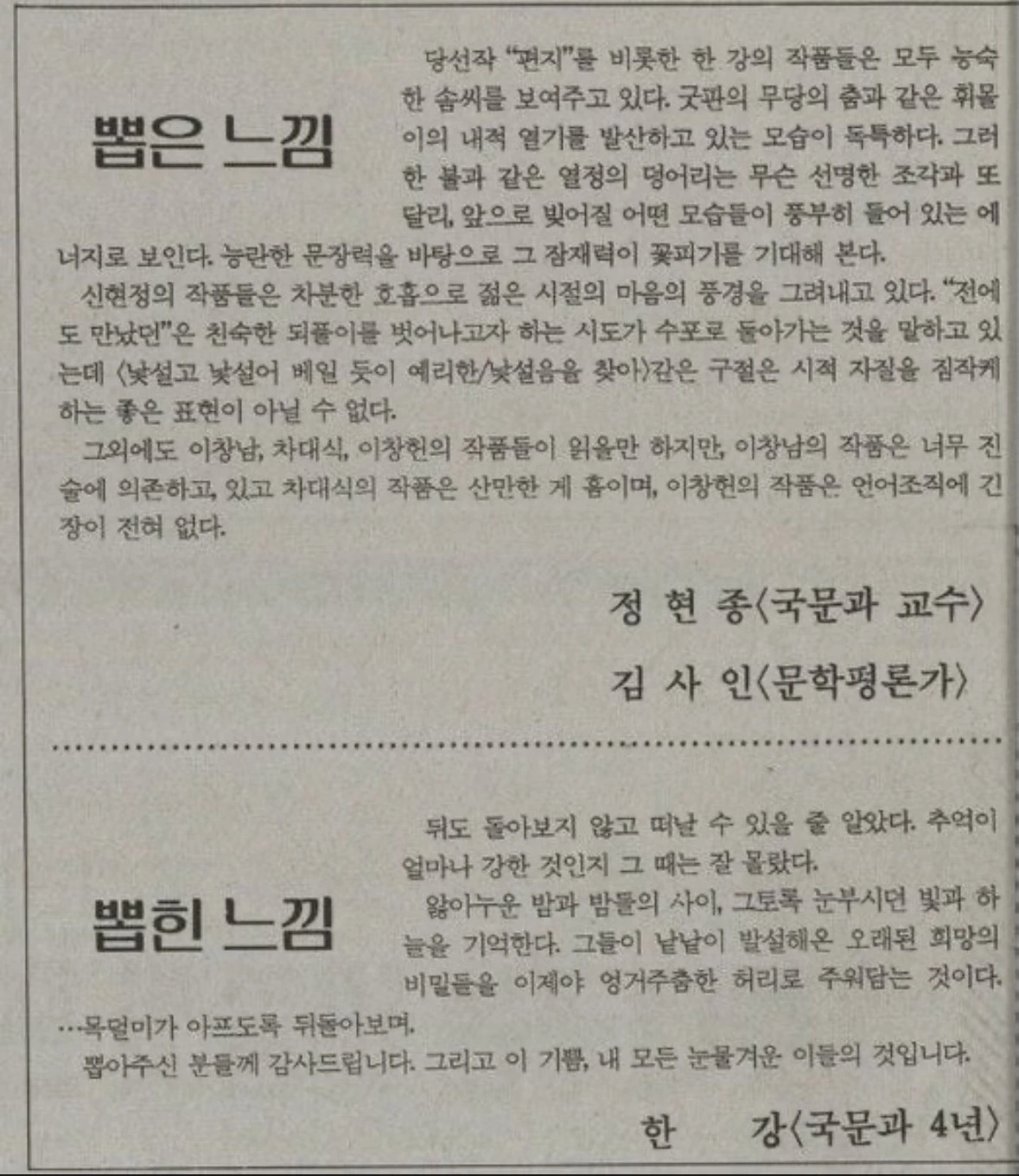 1993년 시 <얼음꽃>으로 등단하기 1년 전, 연세문화상에서 수상한 작품 <편지>이다.