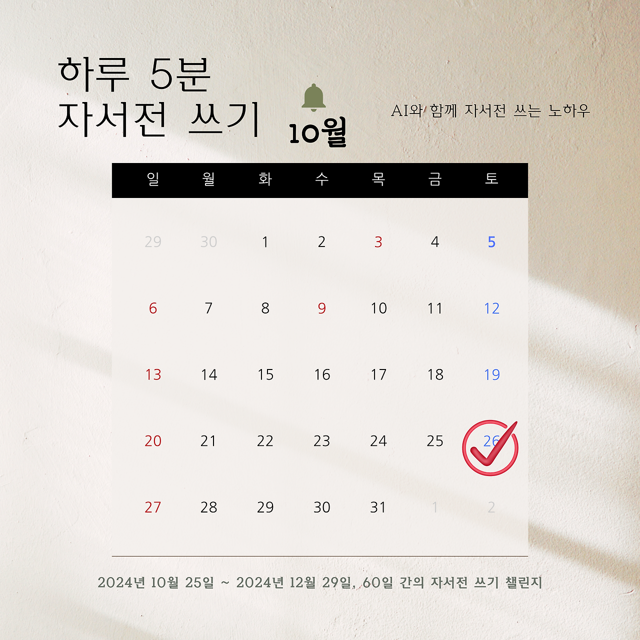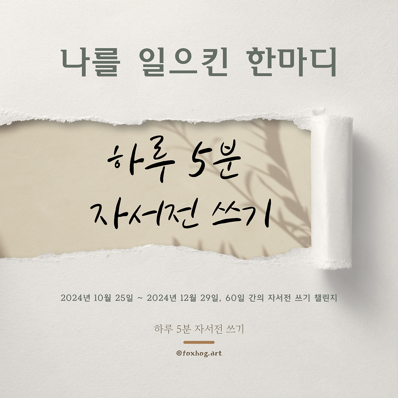 당신의 모든 노력을 응원합니다 | 때로는 한마디의 말이 우리 인생의 터닝포인트가 됩니다. 힘든 순간, 누군가의 따뜻한 말 한마디가 우리에게 날개를 달아주었던 것처럼. 하루 단 5분, "나를 일으킨 한마디"라는 주제로 글을 써보세요. 당신을 일으켜 세운 소중한 한마디를 기억해 보세요. 그 말이 당신에게 어떤 의미였는지, 어떤 변화를 가져왔는지 천천히 떠올려보세요. 자, 함께할까요?