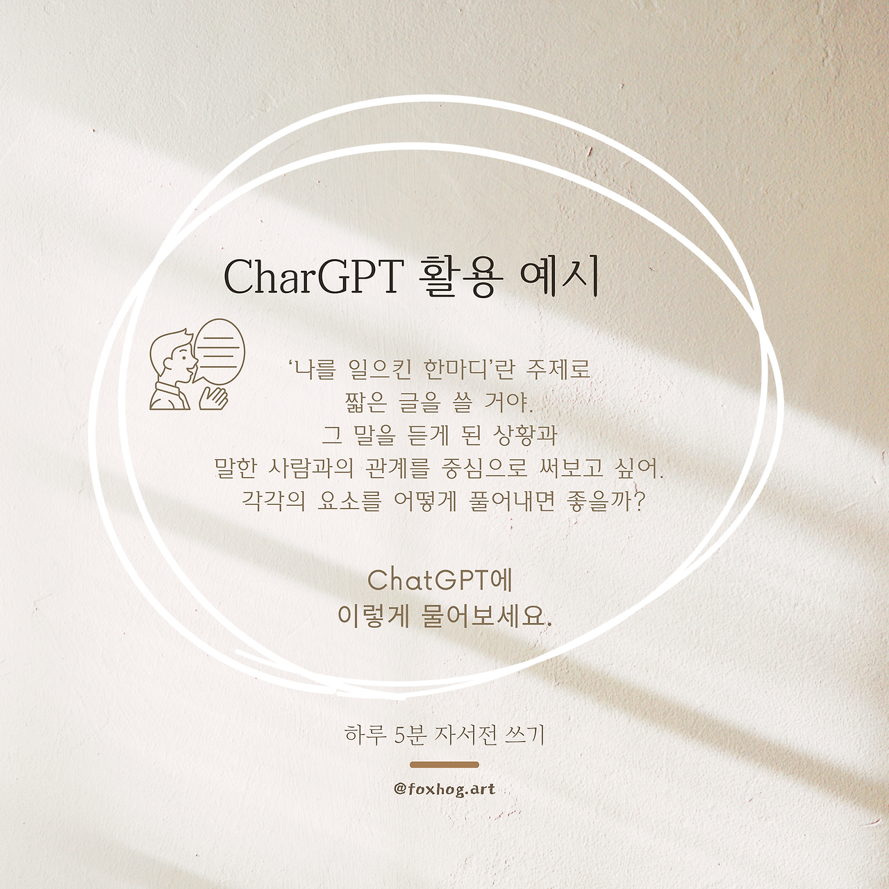 '나를 일으킨 한마디'란 주제로 짧은 글을 쓸 거야. 그 말을 듣게 된 상황과 말한 사람과의 관계를 중심으로 써보고 싶어. 각각의 요소를 어떻게 풀어내면 좋을까?