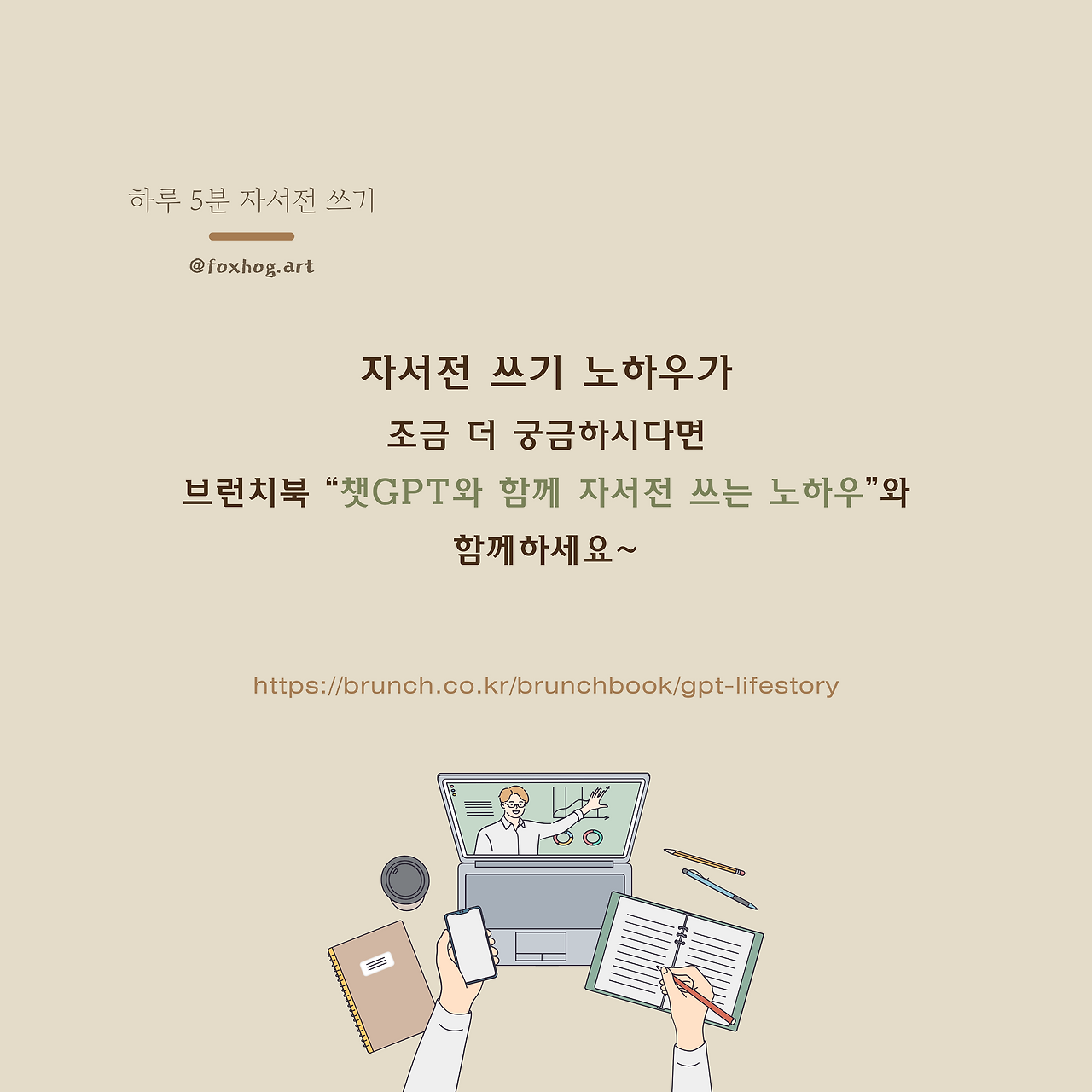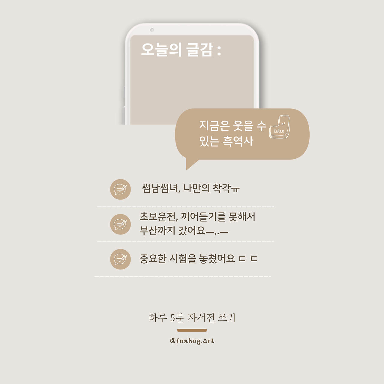 누구나 한 번쯤 '그때 내가 왜 그랬을까?', '니가 어떻게 그럴 수 있어?' 하면서 이불킥한 적이 있을 거예요. 그런 후 지금은 그야말로 이불킥한 몸짓만 생각나고 '그때 왜 그랬지?' 이유도 모를 일이 있을 거예요. 무슨 경험이든 당시에는 괴롭지만 지나고 나면 웃을 수 있는 일이 있답니다. 오늘의 글감은 '지금은 웃을 수 있는 흑역사'입니다. 하루 딱 5분, 자서전 쓰기 시작해 볼까요~