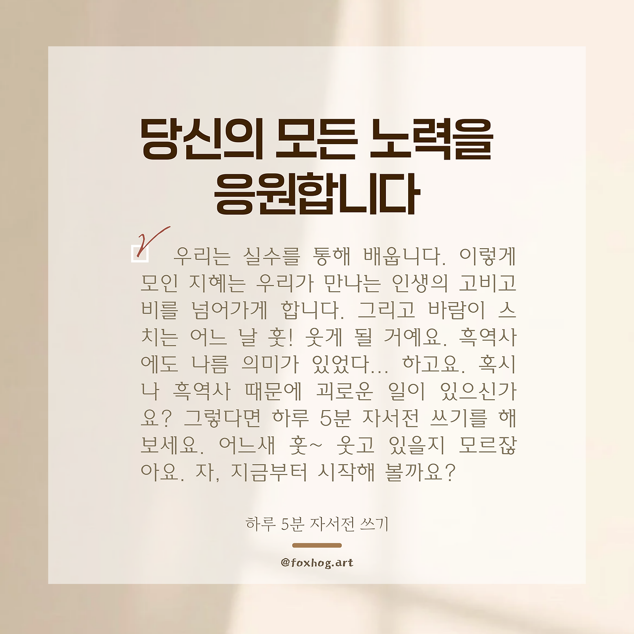 당신의 모든 노력을 응원합니다 | 우리는 실수를 통해 배웁니다. 이렇게 모인 지혜는 우리가 만나는 인생의 고비고비를 넘어가게 합니다. 그리고 바람이 스치는 어느 날 훗! 웃게 될 거예요. 흑역사에도 나름 의미가 있었다... 하고요. 혹시나 흑역사 때문에 괴로운 일이 있으신가요? 그렇다면 5분 자서전 쓰기를 해 보세요. 어느새 훗~ 웃고 있을지 모르잖아요. 자, 지금부터 시작해 볼까요?