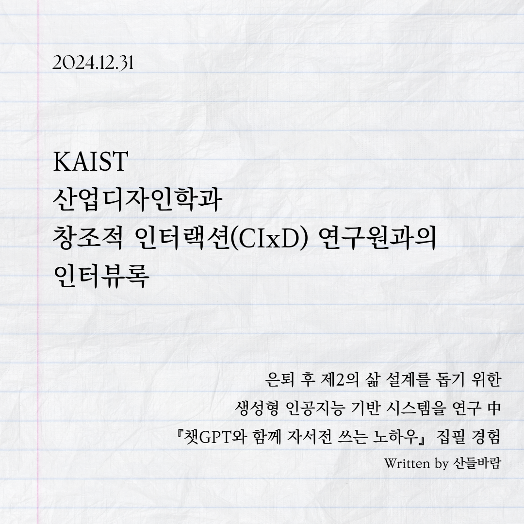 2024년의 마지막 날, 오후 3시. 나는 설레는 마음으로 구글 미트를 켜고 비대면 인터뷰에 응했다. KAIST 산업디자인학과 창조적 인터랙션(CIxD) 연구원이 내 브런치북 『챗GPT와 함께 자서전 쓰는 노하우』를 읽고 연락을 해왔다. 퇴직을 앞두고 인생 2막을 준비하는 중장년층에게 도움이 될 만한 ChatGPT 활용법을 소개한 내 글에 감명을 받았다며, 은퇴 후 제2의 삶 설계를 돕기 위한 생성형 인공지능 기반 시스템을 연구하는데 내 경험을 듣고 싶다고 했다. 2024년 카카오브런치북으로 발행한 『챗GPT와 함께 자서전 쓰는 노하우』가 KAIST의 연구 대상이 된다는 사실은 나에게 특별한 의미였다. 일부러 2024년 마지막 날로 인터뷰 날짜를 잡았다. 내 저서가 학술적 가치를 인정받았다는 기쁨으로 한 해를 마무리하고 싶었기 때문이다.
