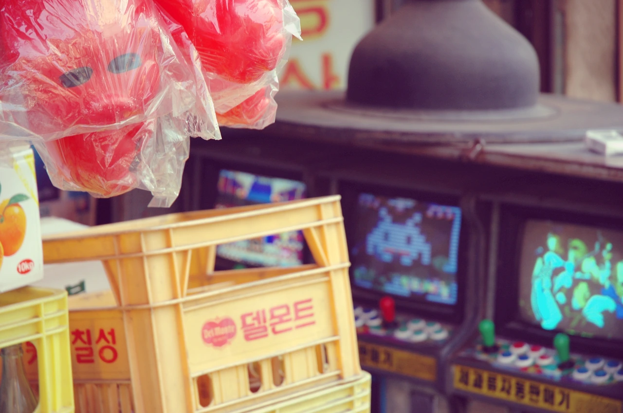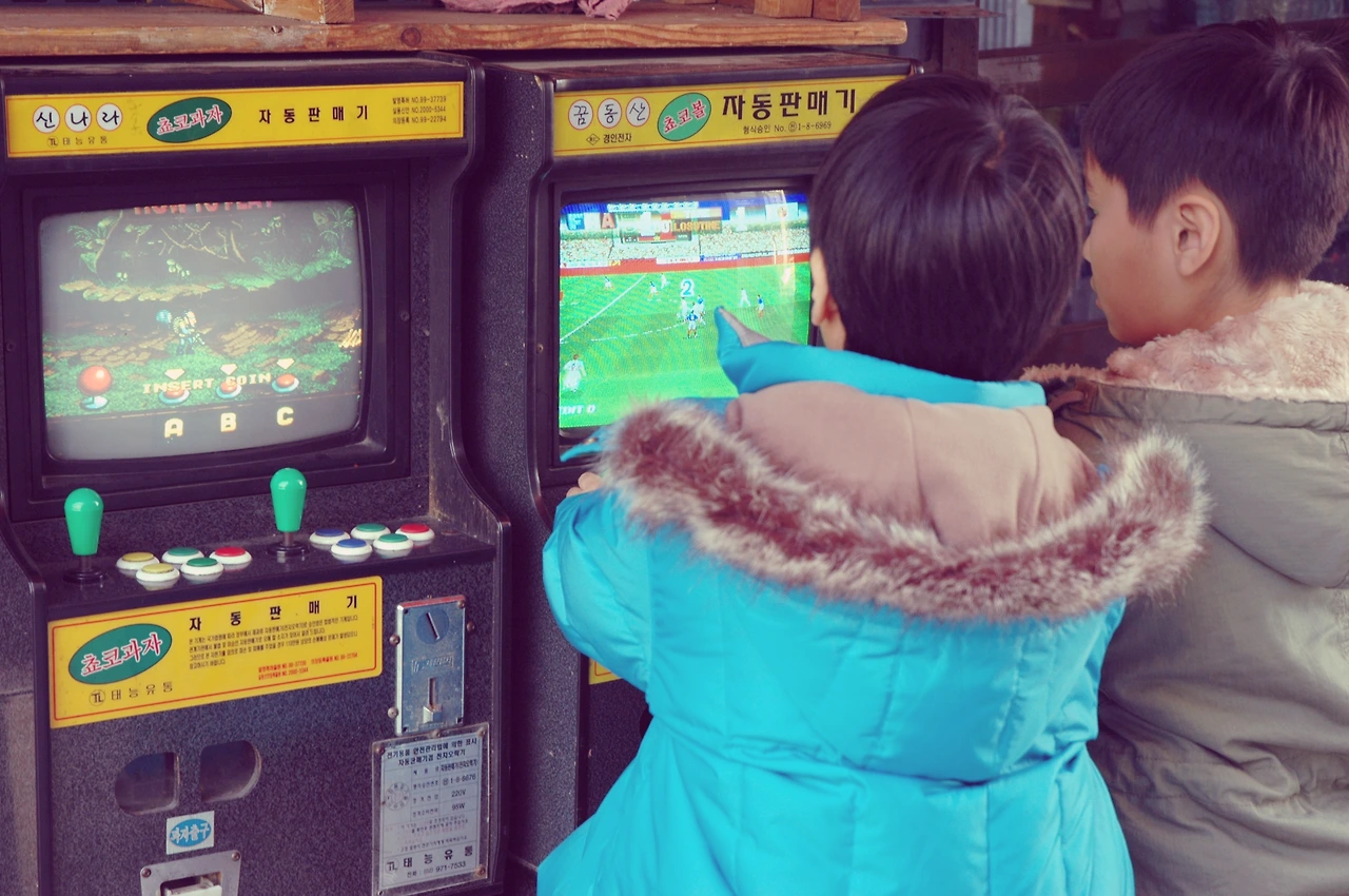 아케이드 오락기에 몰입한 꼬꼬마들,
