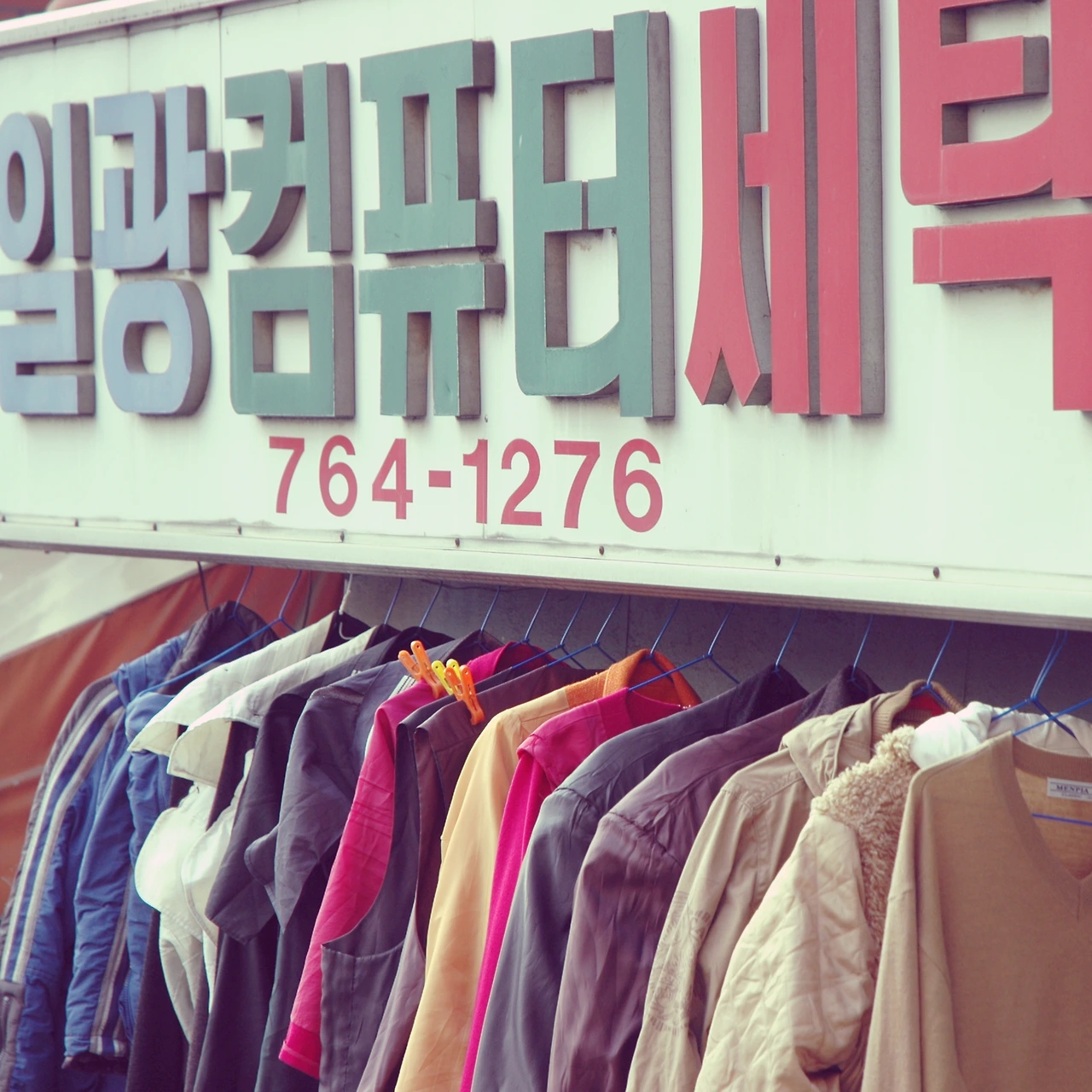 빼곡하게 옷이 걸린 컴퓨터세탁소,