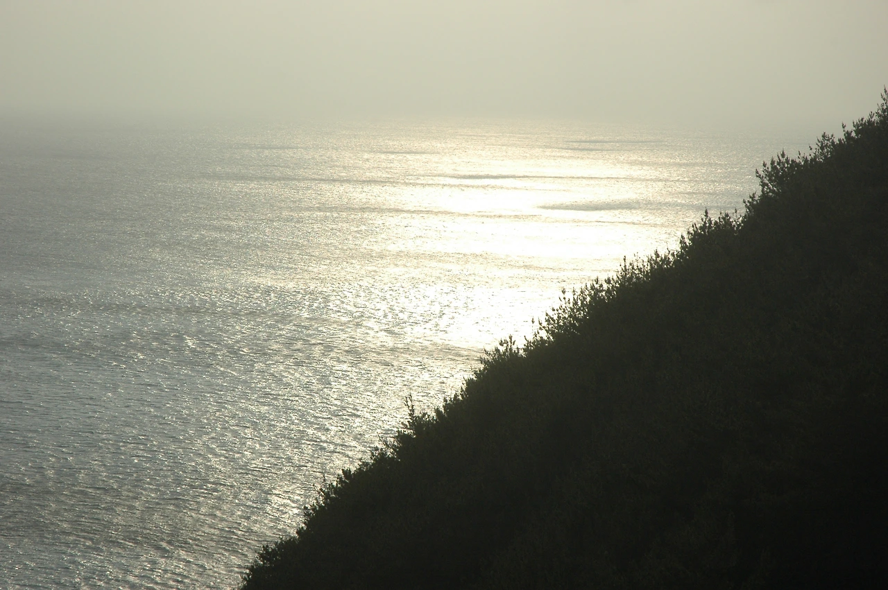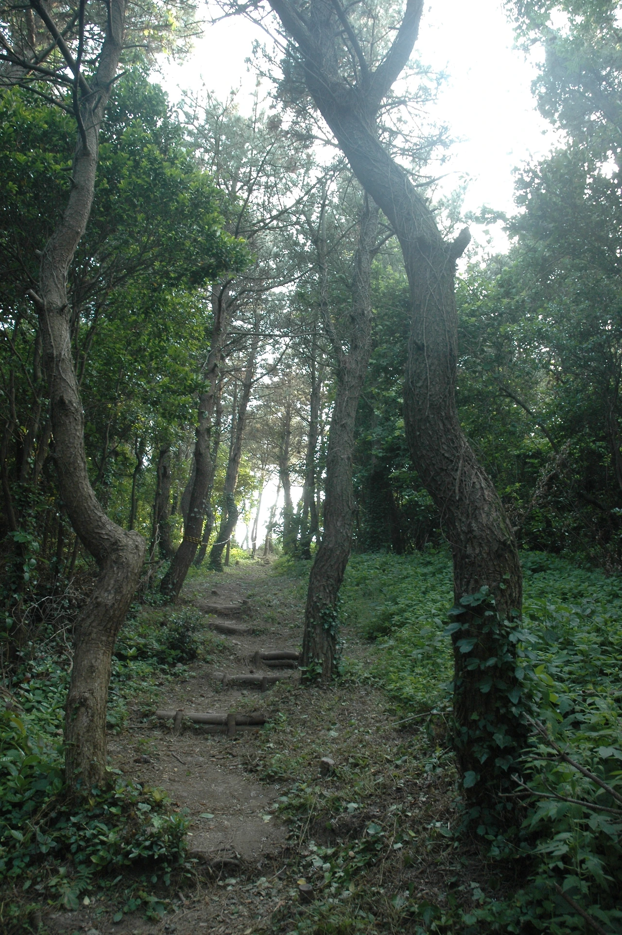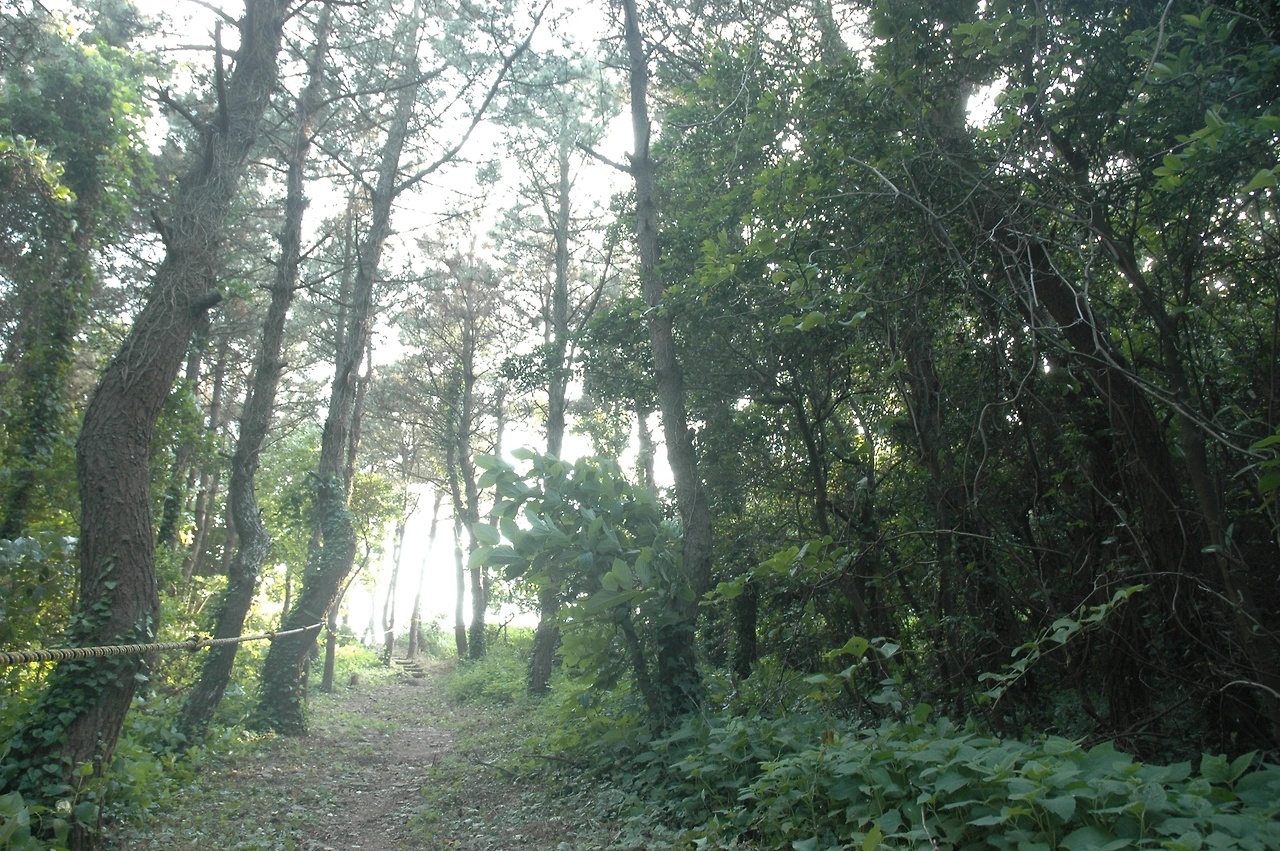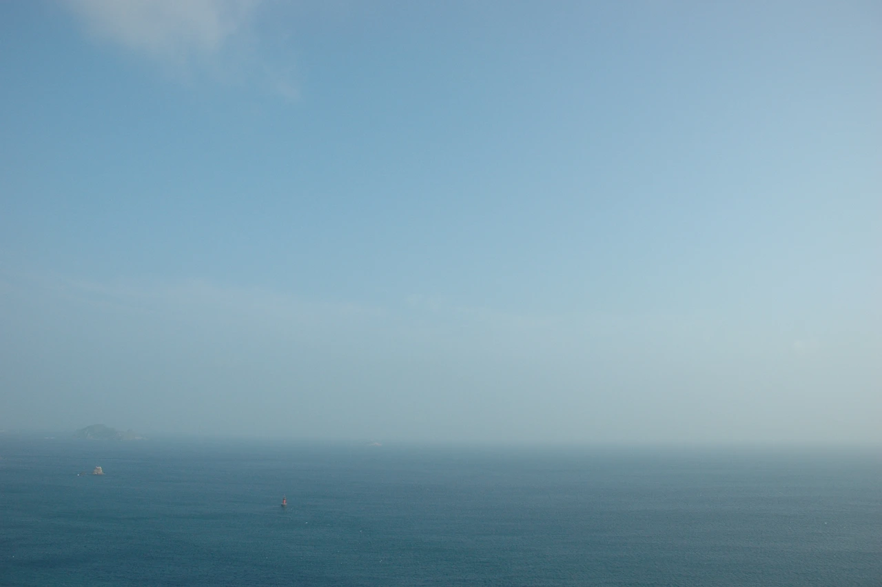 어느새 좁을 산길에 정신이 팔려서 사진을 찍다 보니 정상에 가까워져 있었어요. 가파른 계단 길을 따라 올려다보니 빽빽이 서 있는 나무 사이로 쏟아지는 찬란한 햇빛에 천국의 계단 같다는 생각까지 들었어요. 마지막 정상을 위한 한걸음. 이 한 걸음 딛고 나면 어떤 풍경이 펼쳐질까. 그리고 내디딘 걸음 앞으로 푸른 바다가 하얀 하늘과 만나 있었어요.