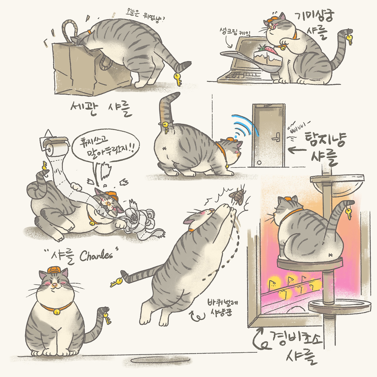 엄마도 이제는 샤를을 너무 좋아하게 되었다. 이 녀석은 마치 우리 집의 파수꾼이라도 된 듯 온 집안을 누비며, 숨겨져 있던 돈을 꺼내오고, 바퀴벌레를 잡고, 심지어 기미상궁 노릇까지 한다. 내가 크림이나 버터가 든 음식, 과자 등 살찌는 음식을 먹으려고 꺼내면 어김없이 어디선가 달려와 음식을 쳐다본다. 내 원참! 크림을 먹는 고양이라니.. 며칠 전에는 자다가 깨서 창가에 앉아 있는 녀석을 보니, 새벽녘 차가 달리는 강변북로를 유심히 쳐다보고 있는 모습에 창밖을 바라보는 시간의 낭만을 되새겨 주기도 하다니, 정말 기특하기 그지없다.