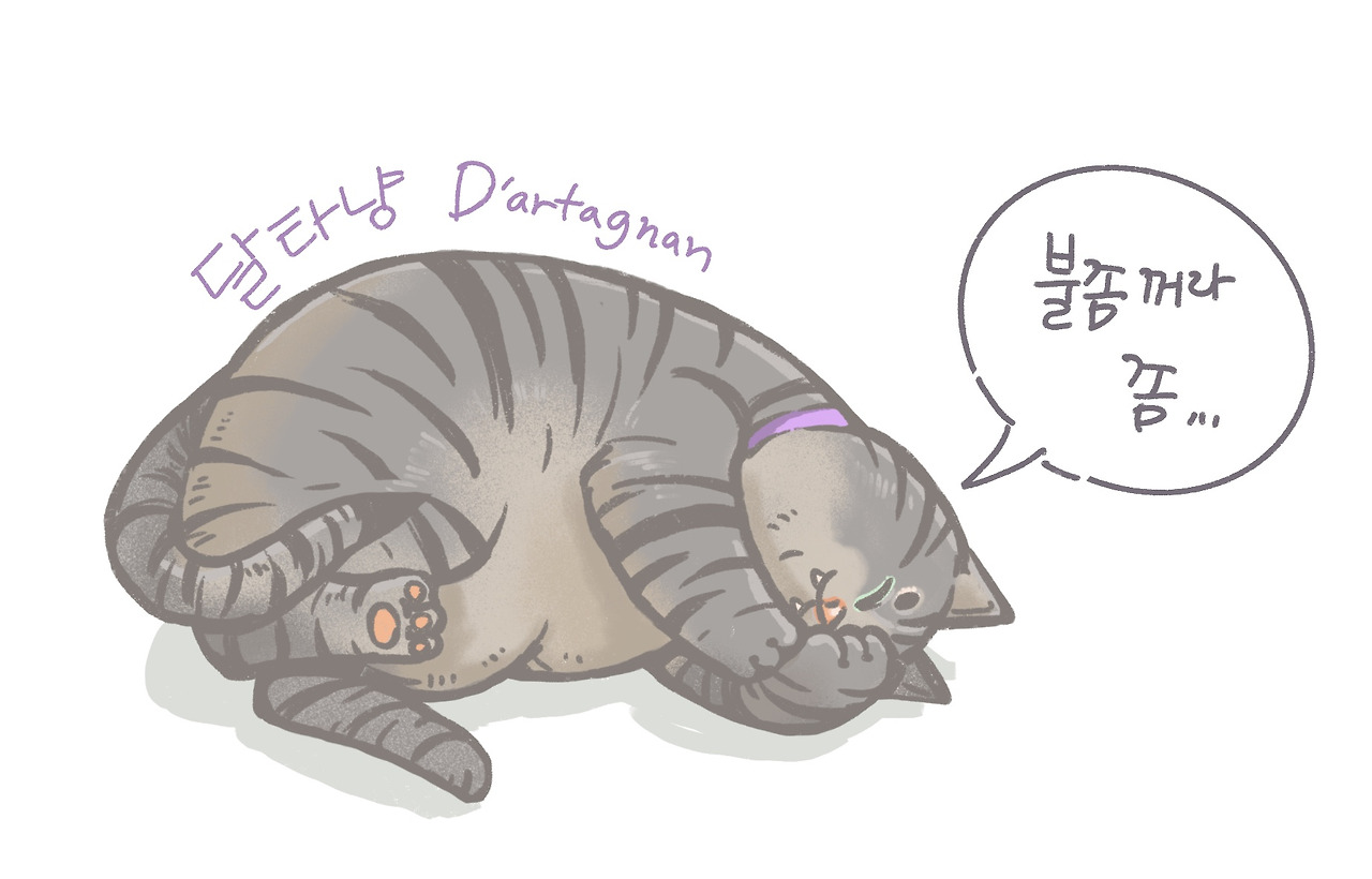 우여곡절 끝에 고양이라면 죽어도 싫다던 우리 엄마가 고양이 돌본다고 집엘 안 들어오는 큰아들 때문에 고양이까지 덥석 집으로 들이게 되었다. 하지만 원체 예민하고 겁이 많은 달타냥은 엄마와 쉽게 친해지질 못했고, 10년이 지난 지금까지도 유일하게 자신을 귀찮게 하지 않는 동생 옆에만 붙어 있는다. 달타냥이 5살 때쯤, 나는 외국 생활을 해보고 싶어 1년 조금 넘는 시간 동안 아일랜드로 떠나게 되었고, 떠나기 한 달 전쯤부터 무언가를 잘못 먹어 많이 아팠던 달타냥 때문에 떠나서도 가슴 한 구석을 집에 놔두게 되었다.
