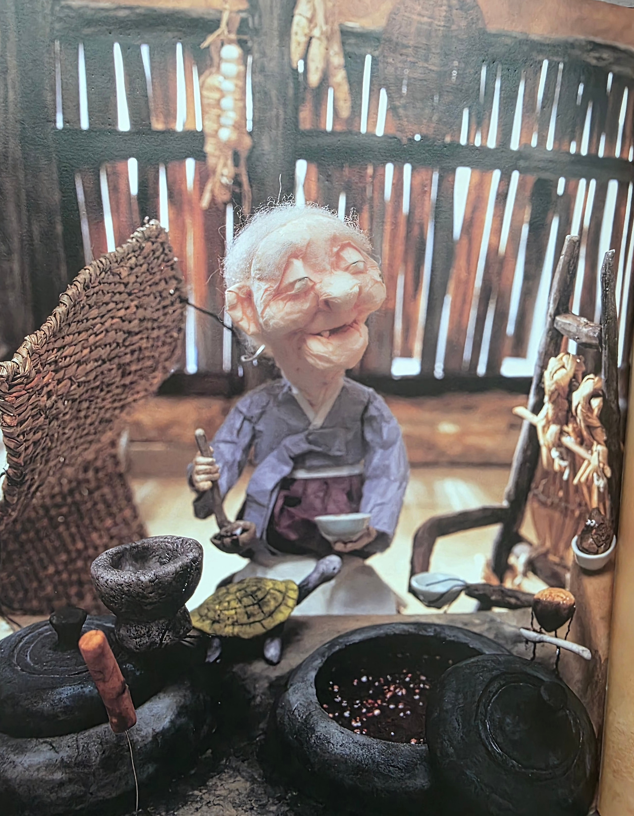 펄쩍펄쩍 도망치려다 돌절구에 이마를 맞고 기절하자, 멍석이 둘둘둘 말아버리고 지게가 덜렁 짊어진 채 겅중겅중 달려가 깊은 강물에 풍덩 던져 버립니다. 그 후 팥죽 할멈은 아무 걱정 없이 팥죽을 팔팔팔 끓여 이웃과 나누며 오래오래 행복하게 살았다는 이야기입니다.
