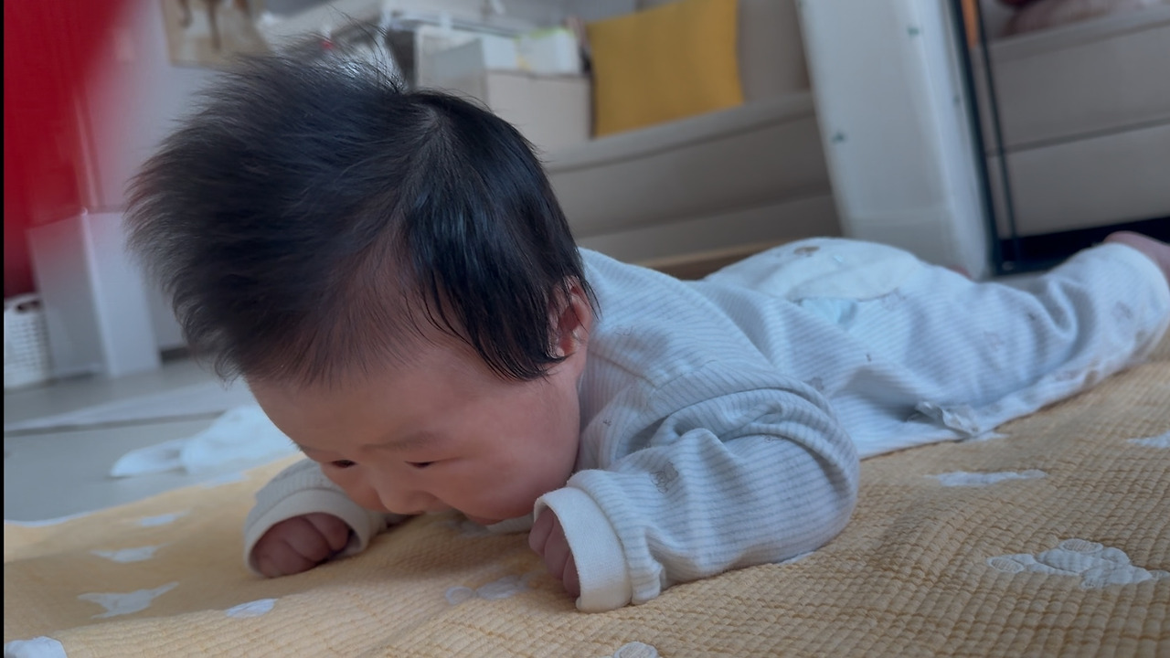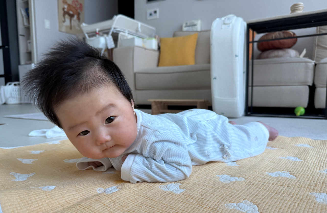 아이에게 토끼 모자를 씌워주니 금방이라도 깡총깡총 뛰어다닐 것만 같습니다. 하지만 아직은 제 머리가 세상에서 제일 무겁다는 듯, 바닥에 엎어두면 금세 울상이 되고 맙니다.