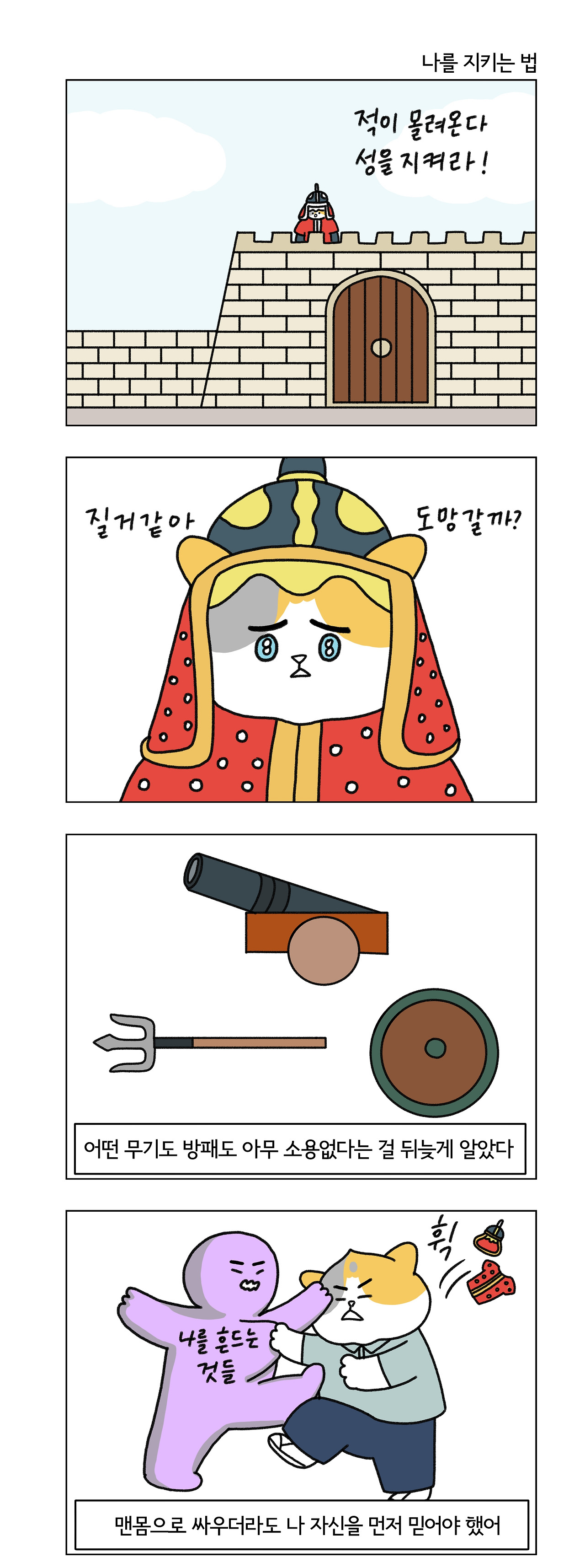 높은 성벽과 두꺼운 성문으로 무장하고 성벽 위에 줄줄이 대포를 배치하고 활을 끊임없이 쏟아내는 사수들이 즐비해도 성 내부에서 이길 수 없다는 소리가 들려오면 결국 지는 싸움이 될 수밖에 없다. 돌이켜보니 나는 매일매일의 전투에서는 살아남으려고 발버둥을 쳤지만 왜 성을 지켜야 하는지 몰랐다. 성을 버리고 떠나고 싶었다. 버티기 위한 방어에만 급급했지 나에게 달려오는 어려움들 앞에서 용기 있게 성문을 박차고 나서 먼저 공격해 볼 엄두를 내지 못했다.