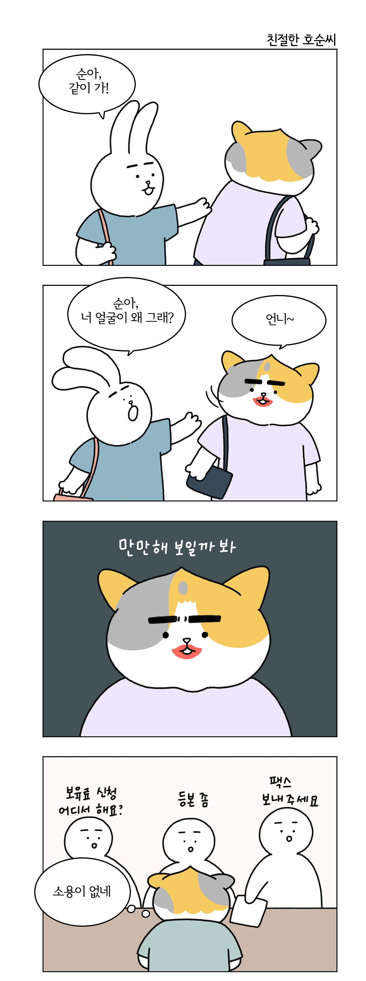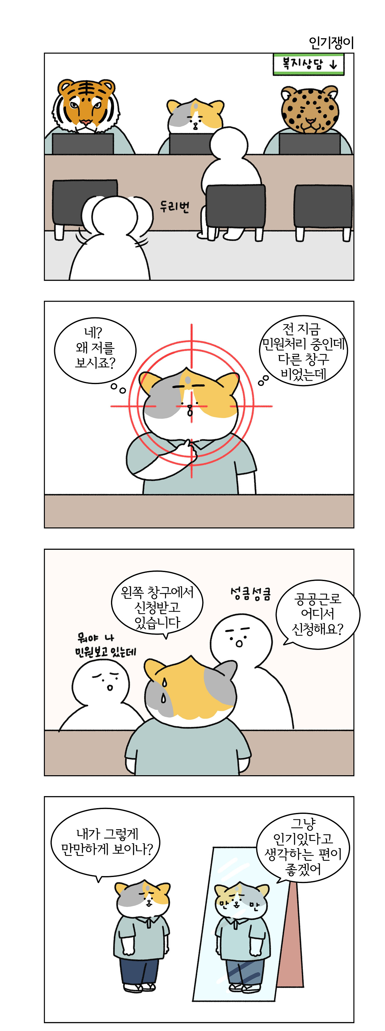 주민센터 민원대에 젊은 여성, 젊은 남성, 나이 있는 여성, 나이 있는 남성이 앉아있다면 상대적으로 젊은 여성이 제일 만만하게 보일 가능성이 크다. 그것도 작은 몸집, 순해 보이는 인상의 젊은 여자 직원이라면 바로 당첨이다. 보통 주민센터에는 따로 안내데스크가 없다. 처음 방문한 민원인이 어떻게 민원을 봐야 하나 애타게 직원들을 스캔할 때 그 레이다망에 내가 자주 포착됐다. 정문 가까이 위치한 자리 탓이라고만 생각하기에는 미심쩍었다. 바로 옆 창구에 눈에 띄게 복지상담이라고 적혀있는데도 내게 복지 관련 질문을 던지고, 굳이 비어있는 창구를 두고도 민원을 보고 있는 내쪽으로 얼굴을 들이미는 경우가 종종 있었다.