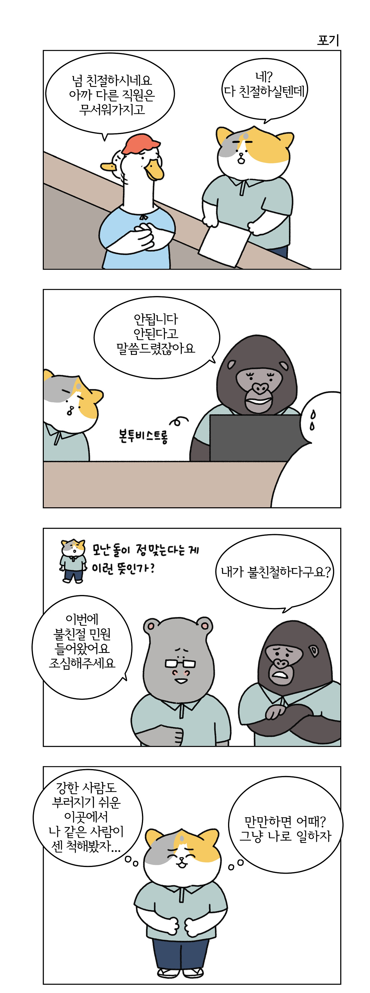 외부 민원, 내부 직원을 가리지 않고 사람을 대할 때 중요한 건 기싸움이다. 만만해 보이는 외모는 어쩔 수 없다고 치자. 하지만 기마저 세지 않다니 타고난 조건이 불리했다. 승자가 되려면 승자의 태도를 취하라는 자기 계발 관련 조언을 따라 일 잘하는 사람을 흉내내기도 했다. 등을 곧추세우고 단정하게 행동하며 최대한 말수를 줄인다. 조용하게 자신의 일을 해내는데 집중한다. 갑자기 격무부서로 발령이 나도, 대직자가 휴직에 들어가 일 폭탄이 떨어져도 호들갑 떨지 않고 자신의 흐름에 맞춰 일하는 직원들을 보면서 나도 그 사람들의 자세를 따라 했다.