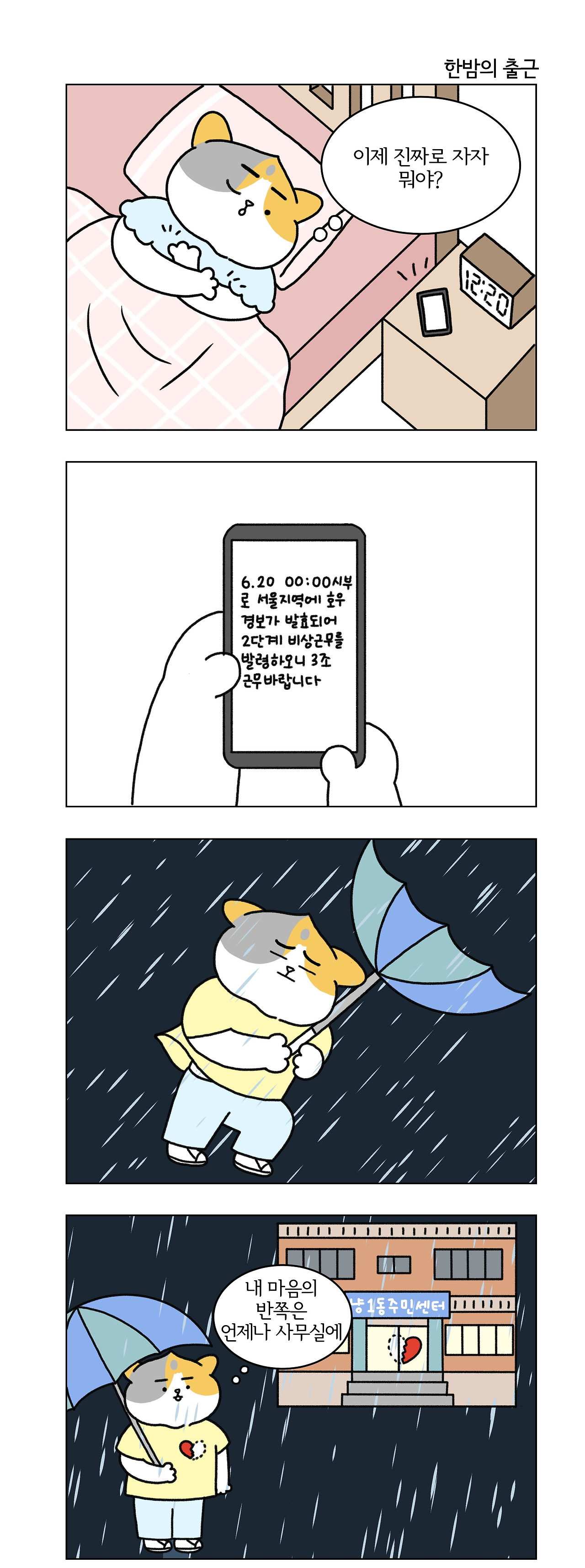 원인 2. 비상근무와 주말근무. 지방직 공무원은 퇴근을 해도 다리 하나는 사무실에 걸쳐놓아야 한다. 문자 하나에 늦은 밤이나 새벽에도 날씨 관련 비상근무를 나간다. 막 공무원이 됐을 때 첫 1~2년간 비와 눈은 왜 그렇게 많이 내리던지. 명절을 보내러 갔다가 다시 사무실로 돌아오기도 하고 주말에 놀러 갔다가 KTX를 타고 출근한 적도 있다. 당시에는 신규여서 대한민국 어디에 있든 비상이 걸리면 무조건 출동해야 되는 줄 알았다. 북한과의 관계는 왜 또 그렇게 악화일로였는지. 주민센터에서 할 수 있는 일은 없지만 천안함 피격사건과 연평도 포격사건으로 밤 12시까지 사무실에서 대기한 기억도 난다. 힘들게 공무원이 됐는데 전쟁이 나는 건 아닌지 불안했다. 그나마 행사로 인한 주말근무는 사전에 고지되니 조금 나았다.