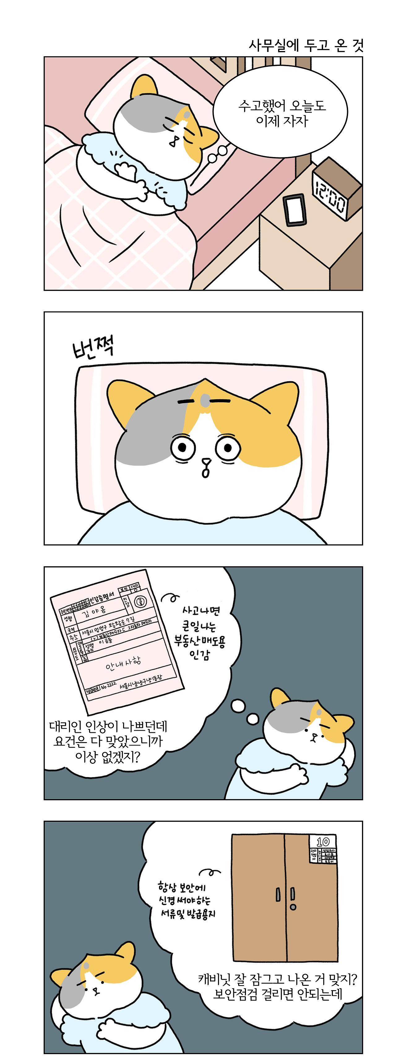 지방직 공무원의 근무여건에 개인적으로 불안도가 높은 성격이 합쳐지니 똑같은 환경에서 일하는 다른 직원들보다 더 쉽게 불안하고 피곤했다. 머리로는 상황을 받아들이고 능숙한 척 일했지만 불안을 자극하는 일이 벌어질 때마다 가슴이 철렁하는 느낌만큼은 끝내 익숙해지지 않았다. 국가에 소속되어 있다는 안정감, 이 조직에서 하나라는 소속감 등 많은 이점에도 불구하고 언제 무슨 일이 벌어질지 모르는 상황이 반복되니 내 직업의 단단한 기반 따위는 사라지고 그 틈새로 새어 나오는 불안에만 시선이 갔다.