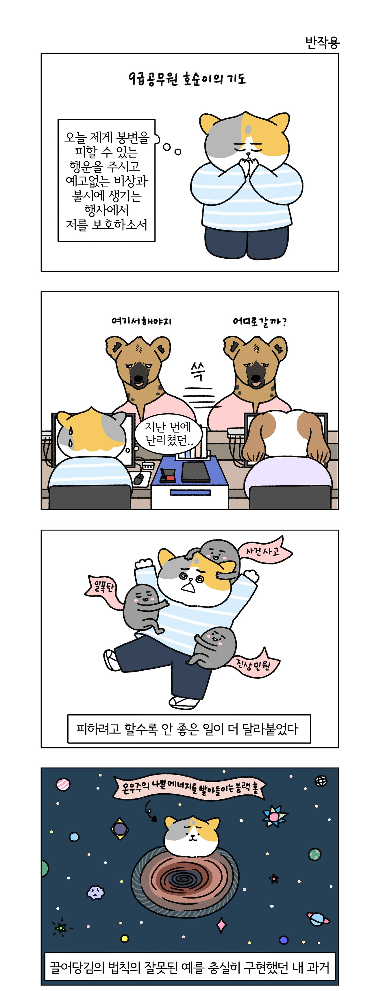 민원이 많았던 어느 날, 큰 소리로 욕을 하는, 겉보기에도 심상치 않아 보이는 사람이 번호표를 뽑았다. 저 사람이 내게 오면 어떡하지 싶어서 식은땀이 나기 시작했다. 그 사람의 순번이 다가오자 갑자기 한 직원이 벌떡 일어나 밖으로 나갔다. 연달아 그 옆에 있던 직원도 나가버렸다. 점심시간이 끝난 지 얼마 안 되어 화장실이 급한 타이밍도 아니었다. 오해일지도 모르지만 상황으로만 판단했을 때 진상 민원을 피해 도망치는 것으로밖에 보이지 않았다. 민원대에 남은 건 나를 포함한 세 사람뿐. 나도 그 민원을 상대하기 싫었지만 꾹 참으면 자리에서 계속 벨을 눌렀다. 이제 그 사이에 두세 명의 민원밖에 남지 않았다. 난 이대로 또 한번의 곤경을 맞게 되는 것인가? 희한하게 나머지 민원들이 모두 다량의 업무를 들고 왔다. 시간이 한참 흐르고 밖으로 나갔던 직원이 돌아와 벨을 눌렀을 때 그 사람의 차례가 됐다. ‘일어날 일은 기어코 일어난다’ 예전에 밑줄을 쳐놓은 문장에 별표를 하나, 아니 여러 개 더 그렸다.