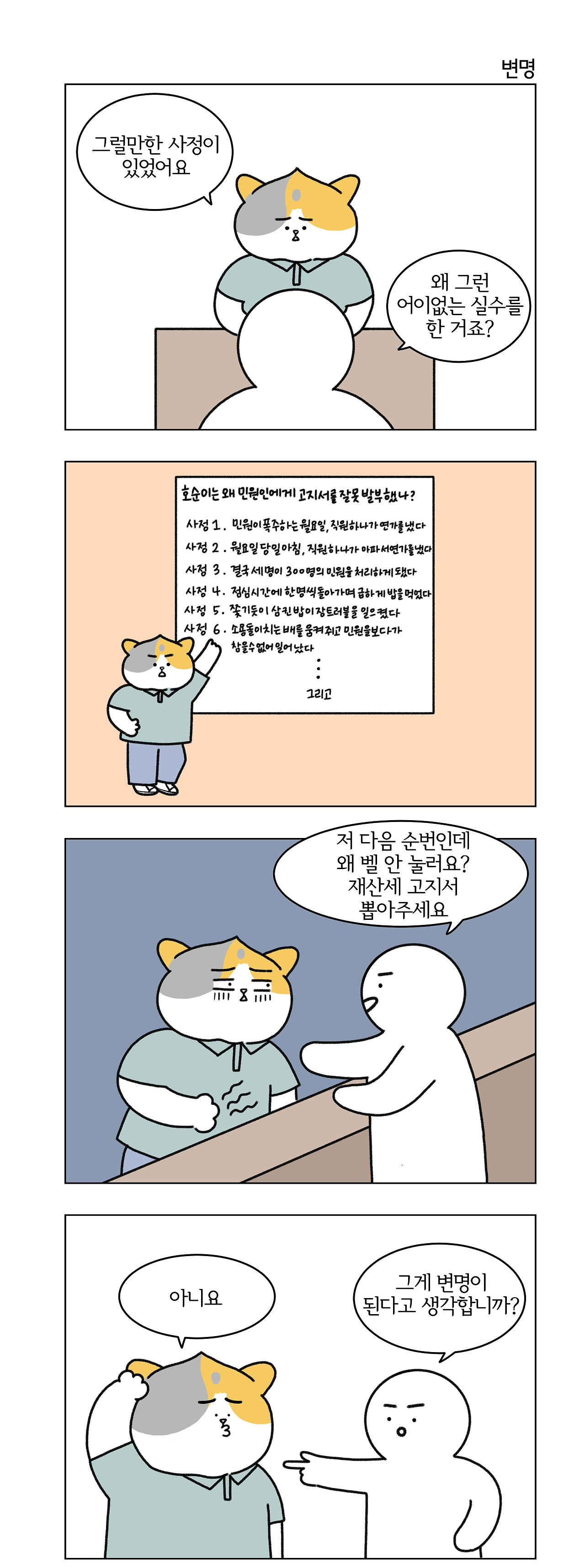 일을 하면 남 탓을 하고 싶은 기회가 생긴다. 예를 들면 전임자의 말만 믿고 그대로 업무를 처리했는데 감사에서 문제가 됐을 때. 인사에 변동이 생기면 가장 먼저 직원들의 업무 분장이 논의된다. 업무분장표에 내 이름과 담당업무가 기재되는 순간부터 그 업무와 관련된 모든 것이 내 책임이다. 인수인계가 아예 이뤄지지 않았든, 전임자가 잘못 가르쳐줬든 어떤 것도 변명이 되지 못한다. 첫 감사를 앞두고 나는 가슴이 철렁한 실수를 그것도 아주 오랫동안 해왔다는 것을 알게 됐다. 6개월 동안이나 다른 기관에 전달해야 할 수수료를 고이 책상 속에 간직하고 있었던 것이다. 전임자와는 친한 사이였고 인사변경 이후에도 나란히 앉아 같이 민원을 보고 있었다. 전산에 제대로 수수료 자료가 뜨지 않아서 어떻게 처리해야 하냐고 물어봤지만 조금만 기다리면 자료가 뜰 거라는 대답에 나도 마냥 기다리기만 했다.