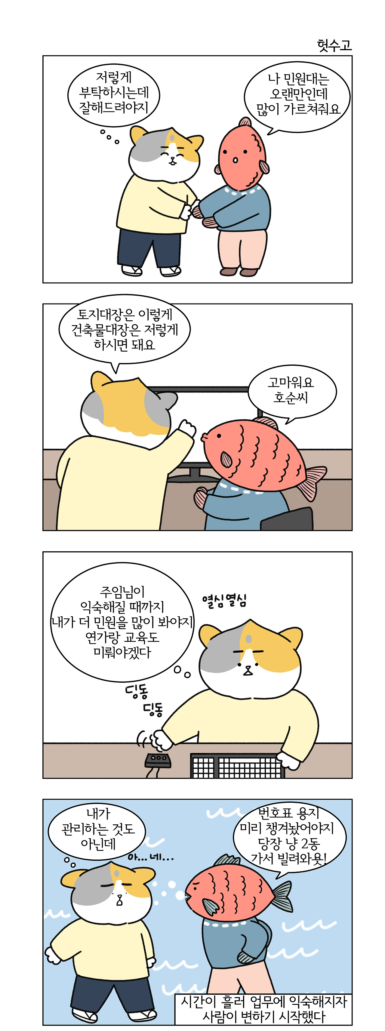 민원에 행사, 잡일에 치여 6개월이 순식간에 흘렀다. 서류를 민원에게 교부하고 교부 처리 버튼만 클릭하면 되는 일이었는데 기본 중의 기본을 놓쳐 이런 일이 생겼다. 감사를 앞두고 팀장님에게 실수를 보고하고 6개월치 자료를 수기로 정리한 후 밀린 수수료 20만 원을 정산했다. 감사팀에게도 이실직고했다. 몇 번이나 물어봤는데 제대로 알려주지 않은 전임자에게 섭섭했지만 그보다는 남의 말만 믿고 제대로 업무를 챙기지 않은 내가 제일 야속했다. 짧은 문장을 마음에 새기고 옆에 별표를 그려 넣었다. ‘내 일은 온전히 나의 책임이다’