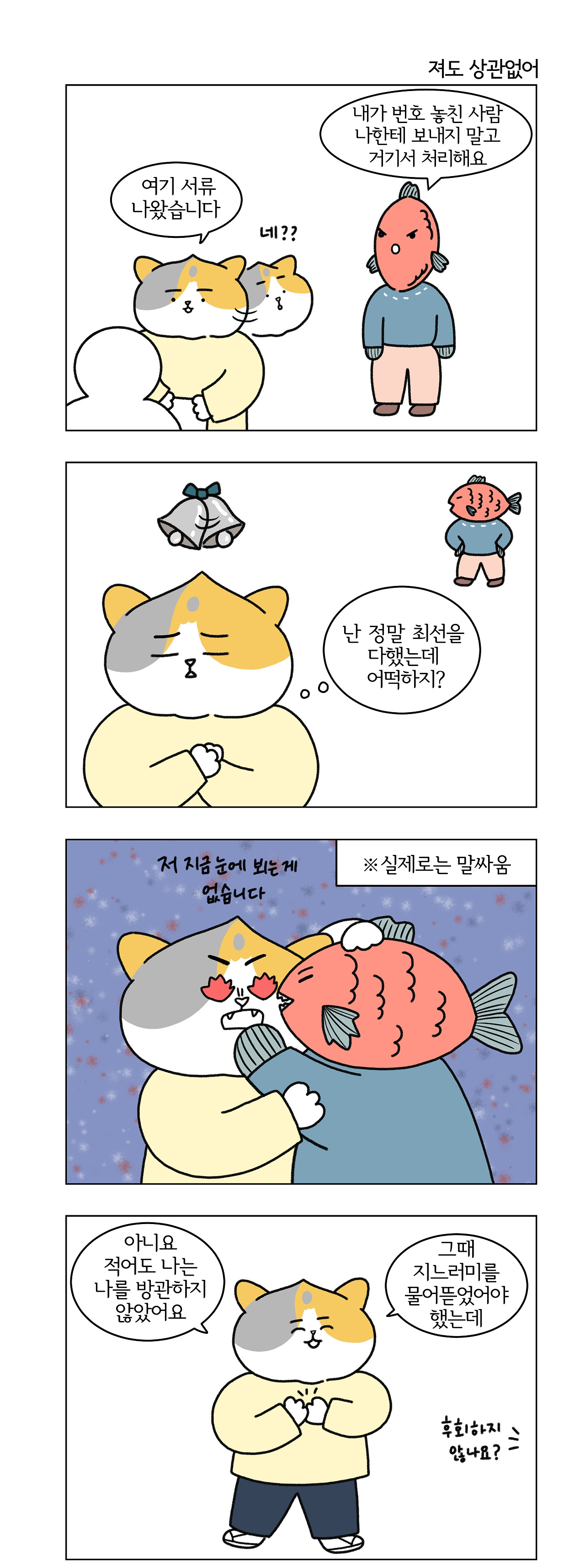 평소에 무슨 일이든 웃고 넘기는 내가 책상에서 일어나서 상대방의 눈을 똑바로 바라봤을 때, 나를 그런 식으로 대하는 행동에 부당함을 제기했을 때 어떤 일이 벌어졌을까? 서로 의견을 나누는 과정에서 강한 스트레스를 받기도 했고 말하는 중간에 버벅거리며 감정적이 되기도 했다. 동시에 심장이 빠르게 뛰고 속이 시원했다. 나를 지키기 위한 행동을 하고 있는 나 자신이 강하게 느껴졌다. 다음에도 이런 상황이 생기면 또 싸울 수 있다는 자신감도 생겼다. 많은 사람들이 주위 시선을 신경 쓰다가 싸워야 할 타이밍을 놓친다. 호구로 보이는 것보다 성질머리가 이상한 사람으로 낙인찍히는 게 훨씬 편한 걸 알면서도.