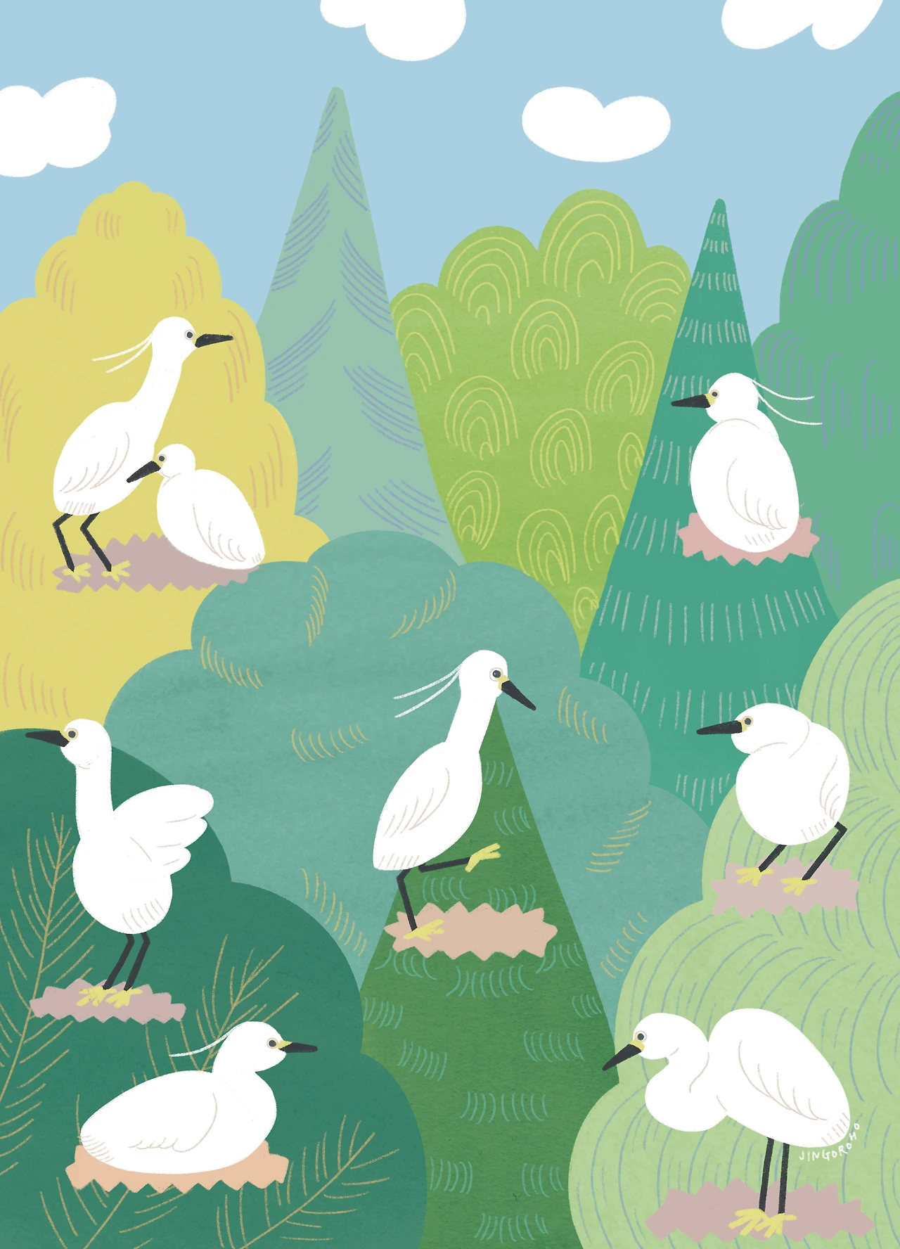 한여름, 수위가 얇은 호수 가장자리에 쇠백로 유치원이 생겼다. 어린 백로들이 여러 마리 모여 어설프게 먹이를 사냥하는 흉내를 내고 있다. 왜가리 두 마리가 선생님처럼 쇠백로 무리에 끼어있다. 유난히 어설픈 한 마리가 날개를 퍼덕이며 물고기를 잡겠다고 겅중겅중 뛰어다니는데 아무것도 잡지 못한다. 시멘트로 된 보 위에 덜 자란 해오라기들이 나란히 앉아 어린 백로가 불필요한 동작으로 에너지를 소비하고 있는 현장을 지켜보고 있다. 그 모습이 꼭 응원이라도 하는 것 같아 웃고 말았다.