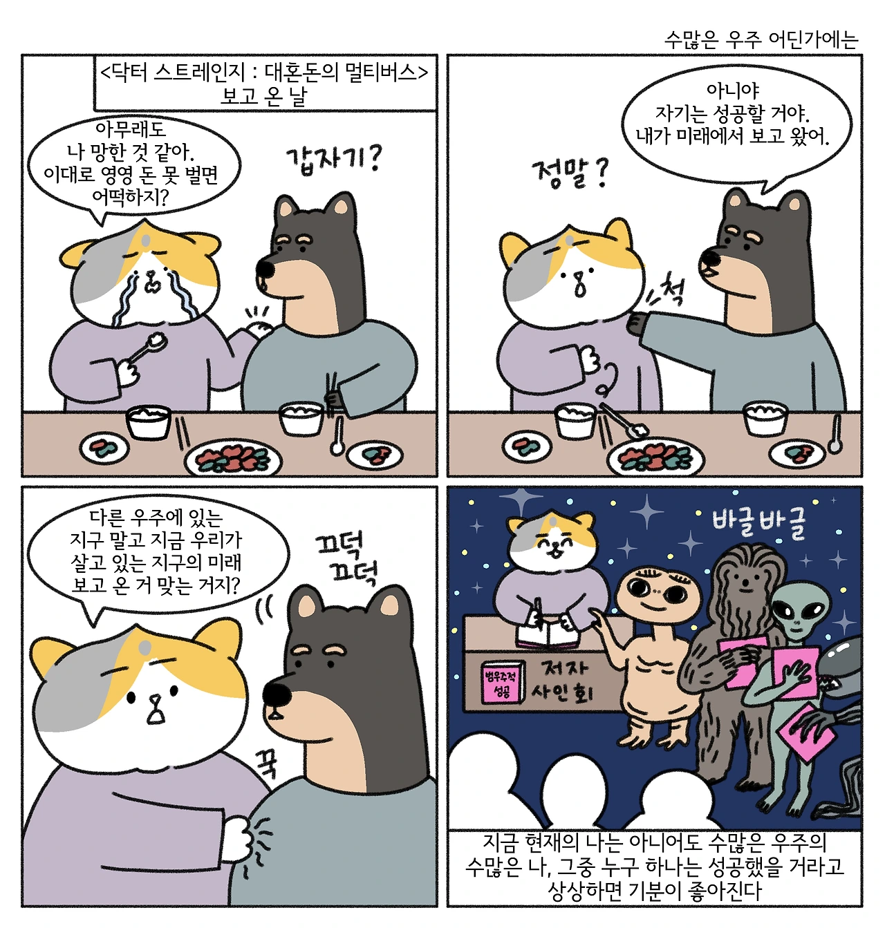 직장을 그만두고 언젠가부터 가끔씩 망했다는 생각이 불쑥 올라올 때가 있다. 혼자 밥을 먹다 불현듯 마지막책을 내고 일 년이 훨씬 지났음을 깨달았을 때처럼. 준비해 놓은 원고도 출판사와 맺은 계약도 없다는 사실이 연이어 떠오른다. 줄줄이 나가야 하는 고양이 병원비와 수술비가 무겁게 얹힌다. 직장을 그만두지 않았다는 가정을 하고 지난 6년간의 월급을 모으면 아무리 적게 잡아도 1억이 훌쩍 넘는다는 계산에까지 생각이 미치면 망했다는 느낌은 도로교통표지판만큼 또렷해진다.