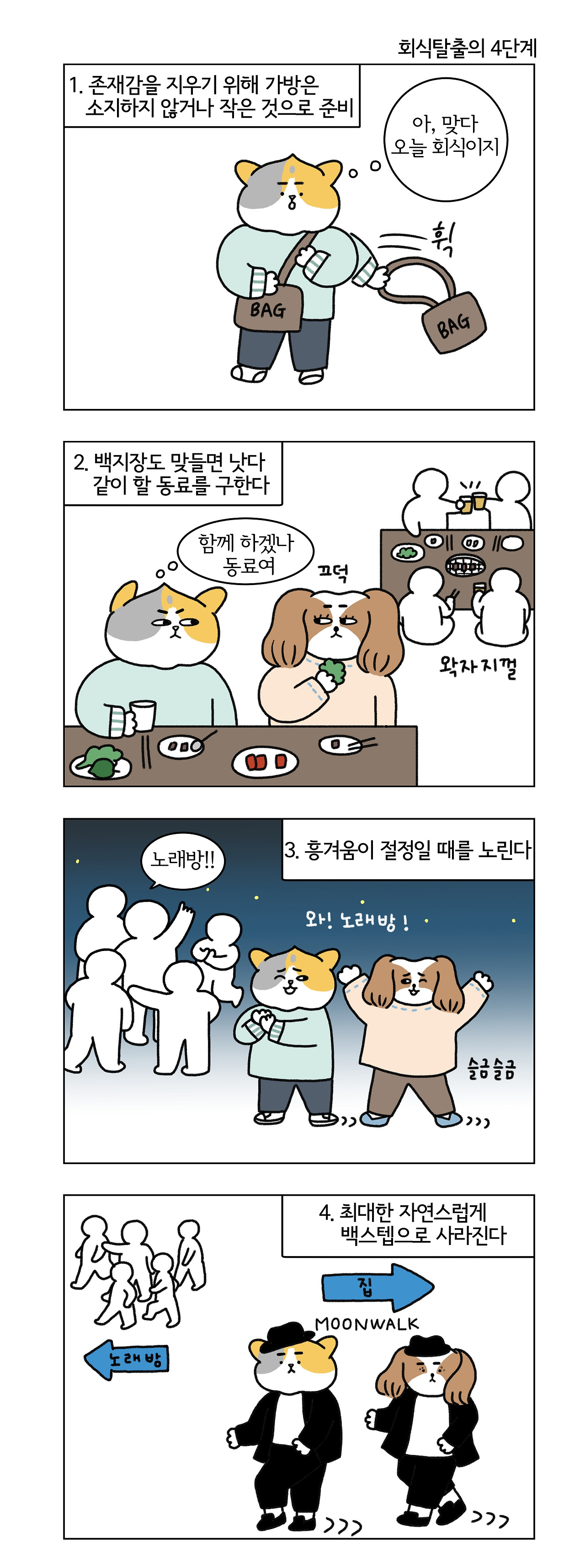 그럴 거면 애초에 회식에 참가하지 않으면 좋았을 텐데 소심해서 그럴 용기는 내지 못했다. 항상 1차 회식이 끝난 후 기회를 노렸다. 정말 열심히 도망갔다. 탈출에 성공한다 해도 안심하기는 이르다. 다음 날 출근해서 왜 어제 도망갔냐고 하는 상사가 있으면 미소에 콧소리까지 섞어가며 "죄송해요. 제가 어제 몸이 너무 안 좋았어요옹~.” 하며 회식 탈출의 끝점을 찍어야 한다. 덕분에 공무원 생활하면서 애교까지 늘었다.
